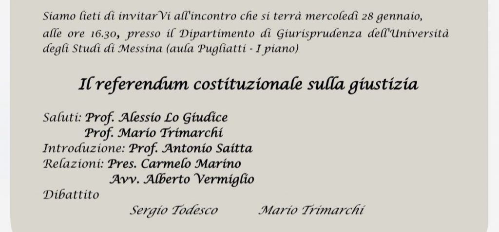 L'incontro si terrà mercoledì 28 gennaio, presso il dipartimento di Giurisprudenza di Unime. A intervenire: Alessio Lo Giudice, Mario Trimarchi, Antonio Saitta, Carmelo Marino, Alberto Vermiglio e Sergio Todesco