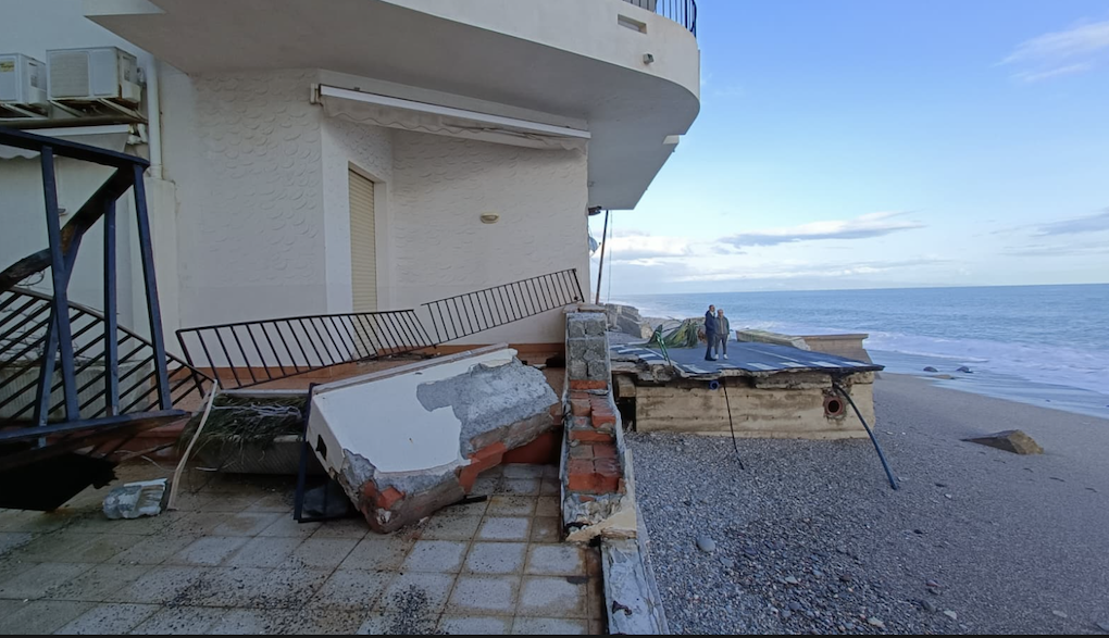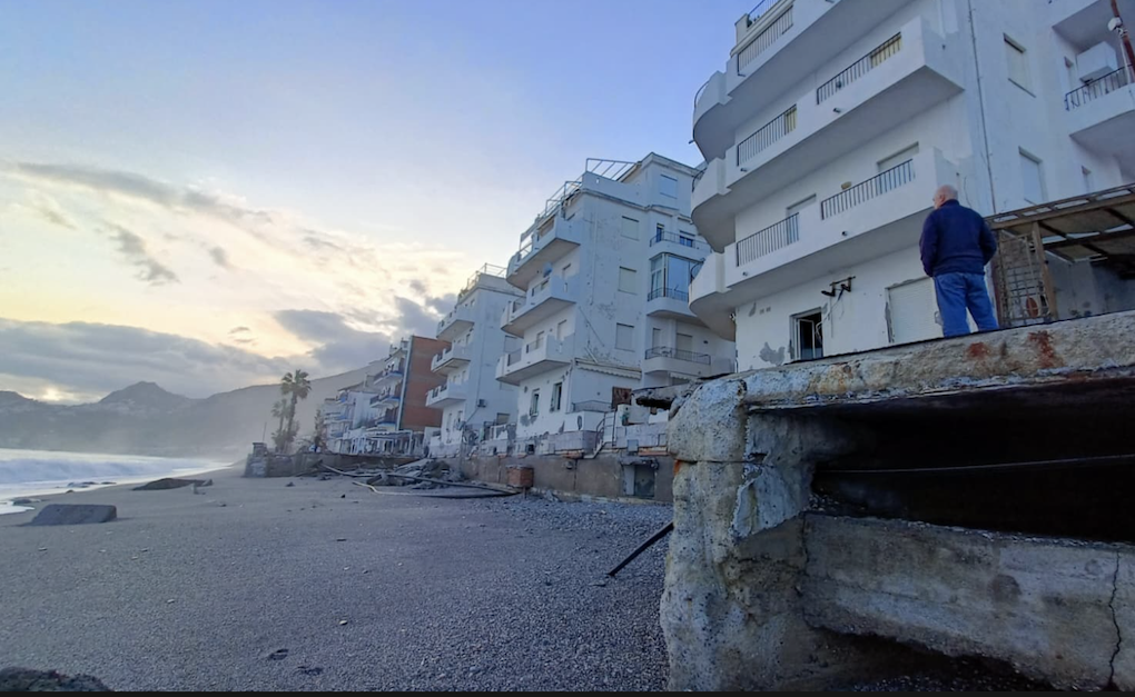 MESSINA. Ci vuole un notevole sforzo di immaginazione, ed un’altra tanto grande sospensione dell’incredulità, anche solo per iniziare a capire quanta energia cinetica le onde abbiano scaricato sul litorale di Letojanni per sbriciolare letteralmente, e poi fare scomparire, un muro di 4 metri e l’intero scatolato che supportava la strada, lasciando a nudo le fondamenta del palazzo, le “case bianche”, ultimo avamposto del paese prima del campo sportivo e del cimitero, che per sicurezza sono state evacuate.