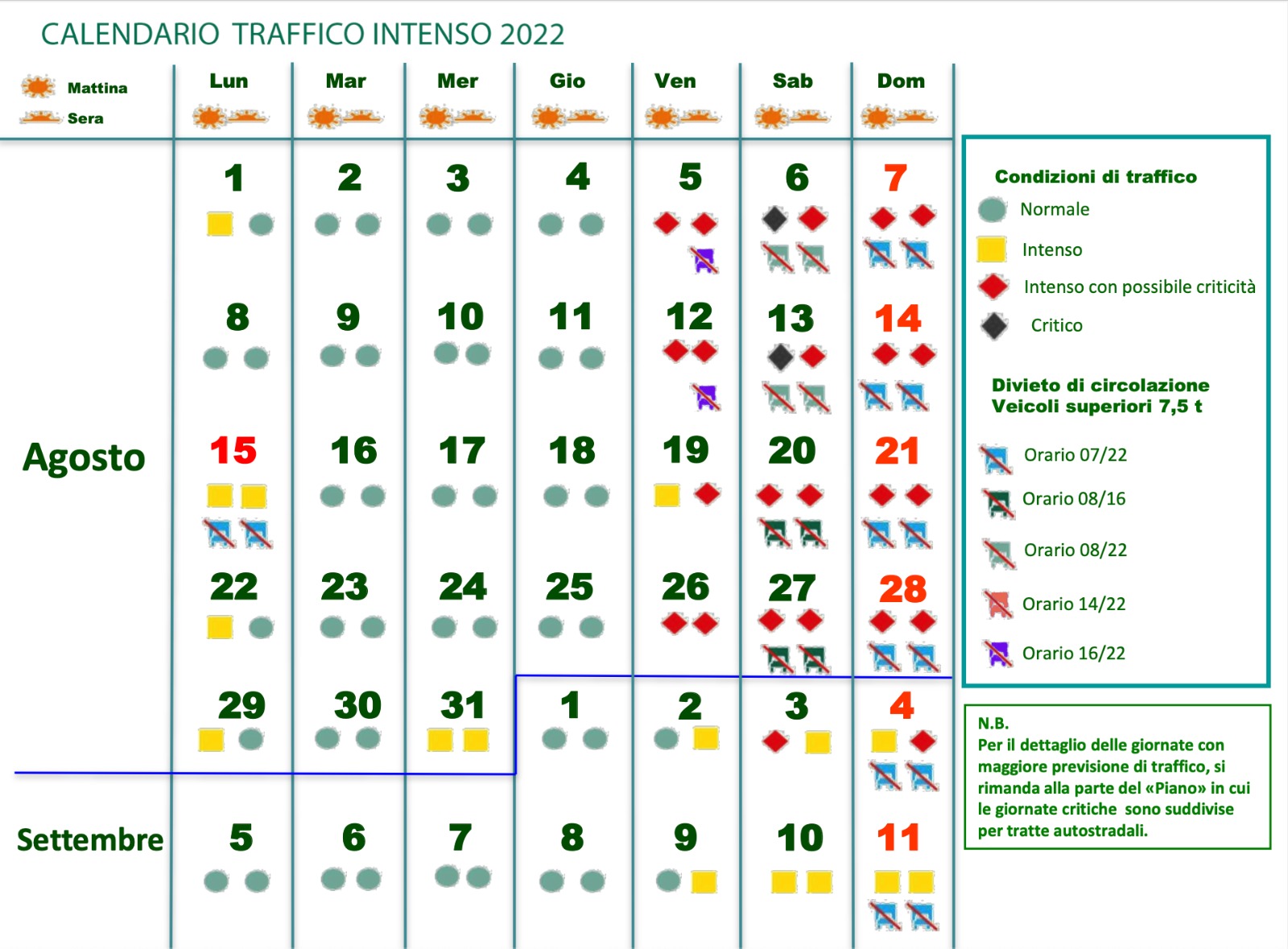 Si raccomanda infine ove possibile di programmare “partenze intelligenti” (mettendosi in viaggio la mattina presto o la sera tardi ed evitando i weekend), pianificare adeguati check up preventivi delle vetture, verificare prima di immettersi in autostrada le condizioni viarie del proprio percorso attraverso i servizi di monitoraggio. Per informazioni aggiornate in tempo reale sul traffico sono disponibili i canali del C.C.I.S.S. (numero gratuito 1518, sitio web www.cciss.it, applicazione per IPhone, canale Twitter @CCISS), le trasmissioni di Isoradio, i notiziari di Onda Verde sulle tre reti Radio Rai e sul Televideo RAI. Anche la diffusissima applicazione Google Maps offre informazioni in tempo reale sullo stato delle strade con tempi di percorrenza e ritardi, colorando di verde quelle in cui il traffico è regolare, di arancione quelle con rallentamenti e di rosso quelle con traffico intenso.