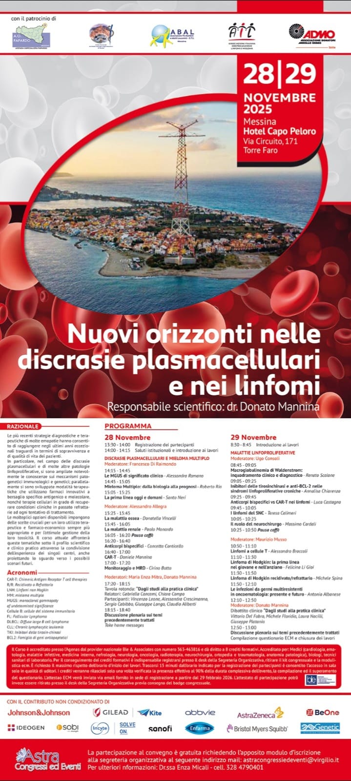 L’evento, organizzato e presieduto dal responsabile scientifico Dr. Donato Mannina, Direttore dell’Unità Operativa Complessa di Ematologia dell’Azienda Ospedaliera Papardo di Messina, vedrà la partecipazione di alcuni tra i maggiori esponenti nazionali nel campo dell’Ematologia. Le più recenti strategie diagnostiche e terapeutiche di molte emopatie hanno consentito di raggiungere negli ultimi anni eccezionali traguardi in termini di sopravvivenza e di qualità di vita dei pazienti e, dunque, questi argomenti saranno al centro dei contributi dei relatori che interverranno sotto il profilo scientifico e clinico pratico, proiettando lo sguardo verso i possibili scenari futuri. Il convegno è patrocinato da A.O. Papardo, OMCEO di Messina, A.B.A.L., Ail e ADMO, ed è accreditato presso l’Agenas per le seguenti figure professionali: medici (cardiologia, cardiolodia; ematologia; malattie infettive; medicina interna; Nefrologia; neurologia; oncologia; radioterapia;neurochirurgia, ortopedia e traumatologia; anatomia patologica), biologi, e tecnici sanitari di Laboratorio Biomedico, e conferirà di diritto 8 crediti formativi ECM. Per informazioni ed iscrizioni è possibile rivolgersi alla Segreteria Organizzativa ai seguenti contatti: Enza Micali(328 47904019 o scrivere a astracongressiedeventi@virgilio.it.