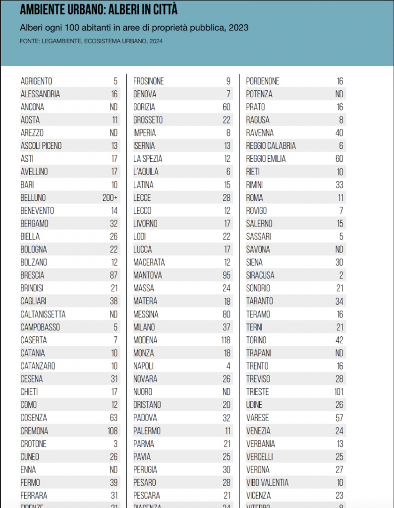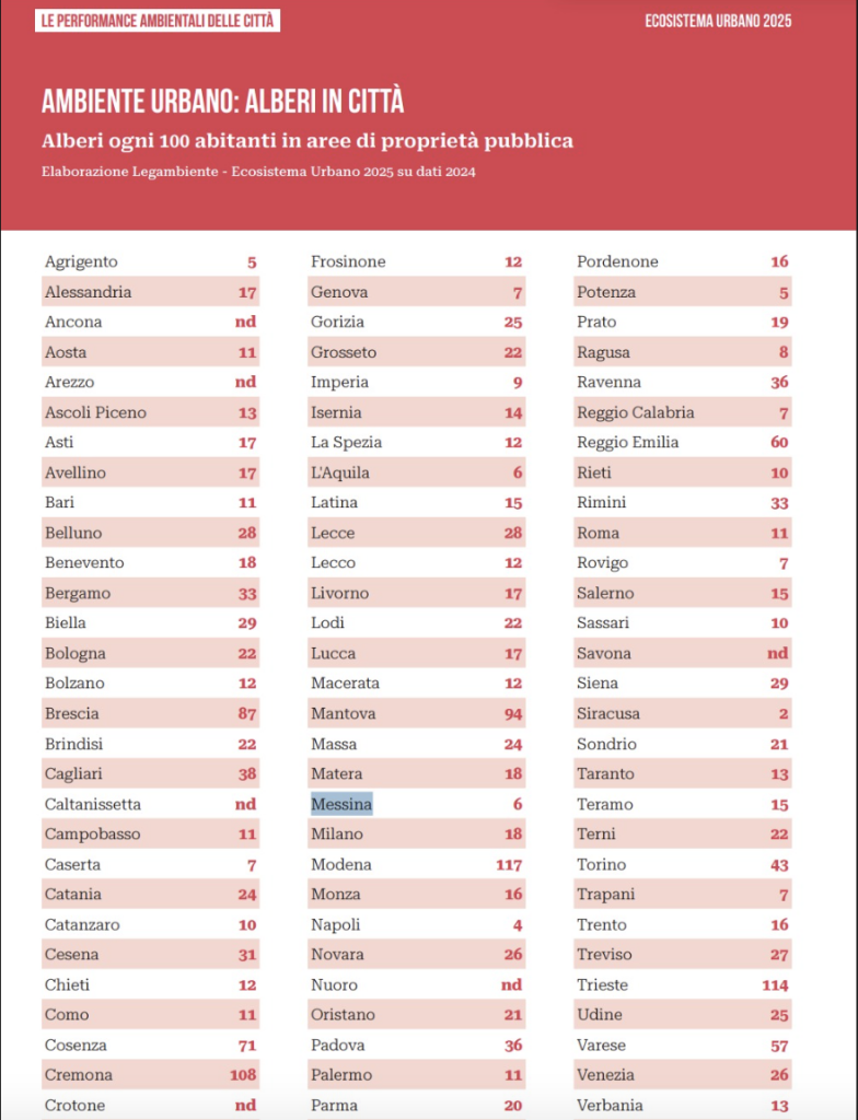 A rimettere le cose sui binari della ragionevolezza è Legambiente, che pubblica il report insieme al Sole 24 ore, tramite le stesse fonti, ma riposta 80 alberi per cento persone (e non centomila) nella classifica 2024, e 6 nel 2025. Anche qui, però, sbagliando. Perchè, se fossero esatte le proporzioni di Legambiente, Messina avrebbe 170mila alberi, dando per buoni i numeri del 2024. Se però si prendono per buoni i numeri del 2025, Messina avrebbe, a spanne, circa 13.200 alberi. Un numero abbastanza vicino a quanto dichiara MessinaServizi come patrimonio arboreo cittadino, cioè 17.189 alberi (a giugno, prima del taglio delle circa trenta piante tra luglio e settembre), nonchè combaciante con l’83mo posto con 6,40 piante della graduatoria del 2023.