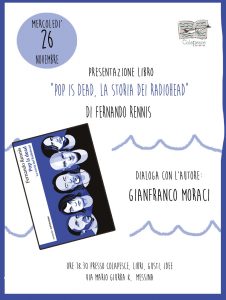 MESSINA. Doppio appuntamento nella serata di oggi, 26 novembre, dalle ore 18.30 in poi, da Colapesce – libri, gusti, idee, in via Mario Giurba 10, per una serata, all’ insegna dell’arte, della musica e delle parole, dedicata alla creatività contemporanea. L’ appuntamento si aprirà con l’inaugurazione della mostra dell’illustratore Gianfranco MoraciDrawn From Music”: una raccolta di opere capaci di trasformare brani, sonorità ed immaginari musicali in delle immagini vere e proprie, andando a tracciare un percorso artistico che esplora la relazione tra segno, emozione e ritmo, restituendo così alla musica una nuova forma che abbraccia colori e linee. Si proseguirà, dunque, con la presentazione del libro “Pop is Dead. La storia dei Radiohead” di Fernando Rennis per Nottetempo Edizioni. A dialogare con l’autore ci sarà Gianfranco Moraci per guidare il pubblico presente alla scoperta dell’evoluzione artistica dei Radiohead, dalle origini al loro impatto sulla cultura musicale contemporanea offrendo l’opportunità di andare ad approfondire la storia di una delle band più influenti degli ultimi decenni, tra sperimentazione e rivoluzione pop.