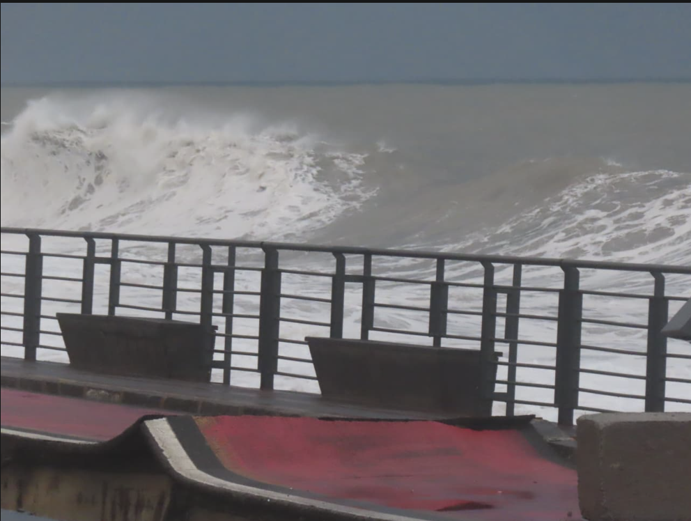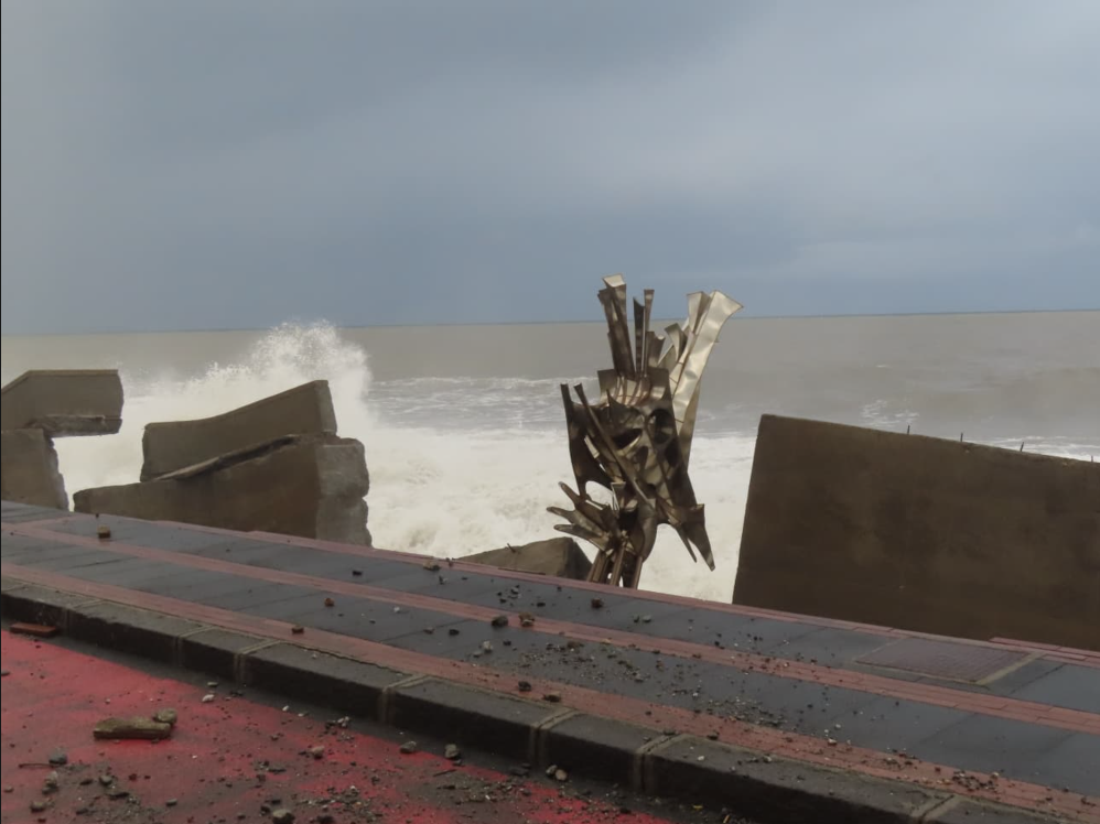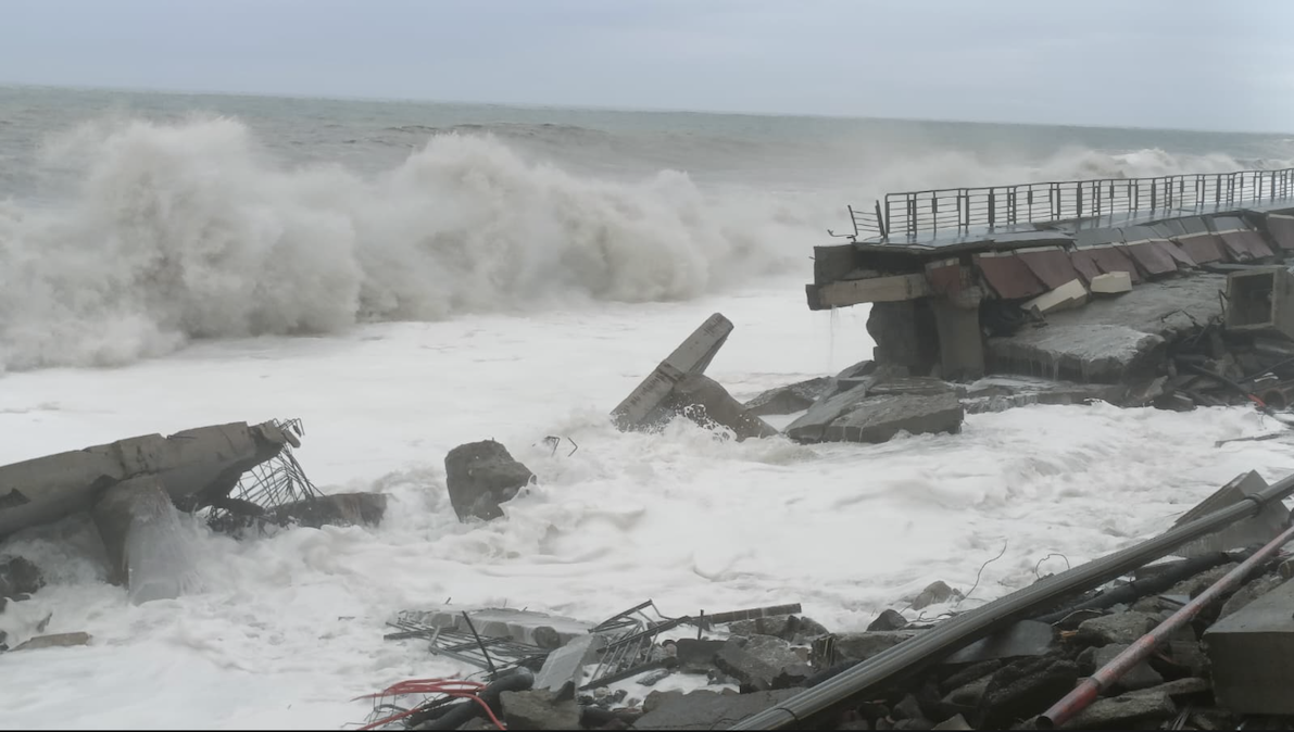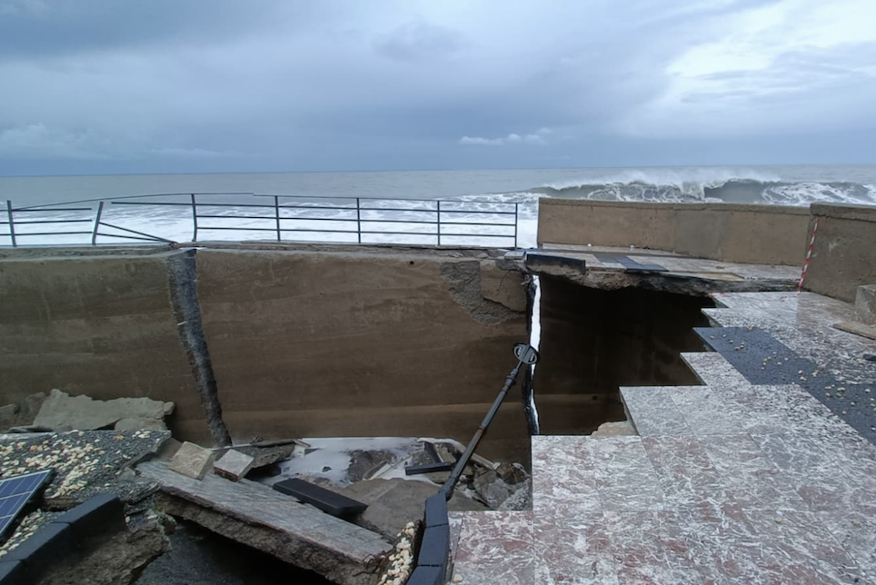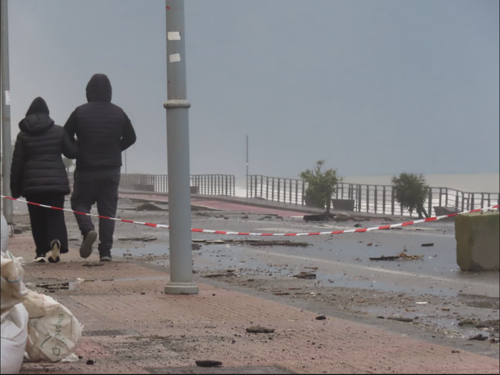 Anche oggi, in cui era previsto un miglioramento, le onde non hanno smesso un attimo di martoriare il lungomare, che sembra veramente un campo di battaglia dopo un fuoco di artiglieria. I pochi che sono costretti a passarci, lo fanno con passo svelto e soprattutto ben attenti a stare sul marciapiede lato monte, che la fenditura nella strada che è apparentemente ancora intatta non promette nulla di buono: tutto il resto è distruzione.