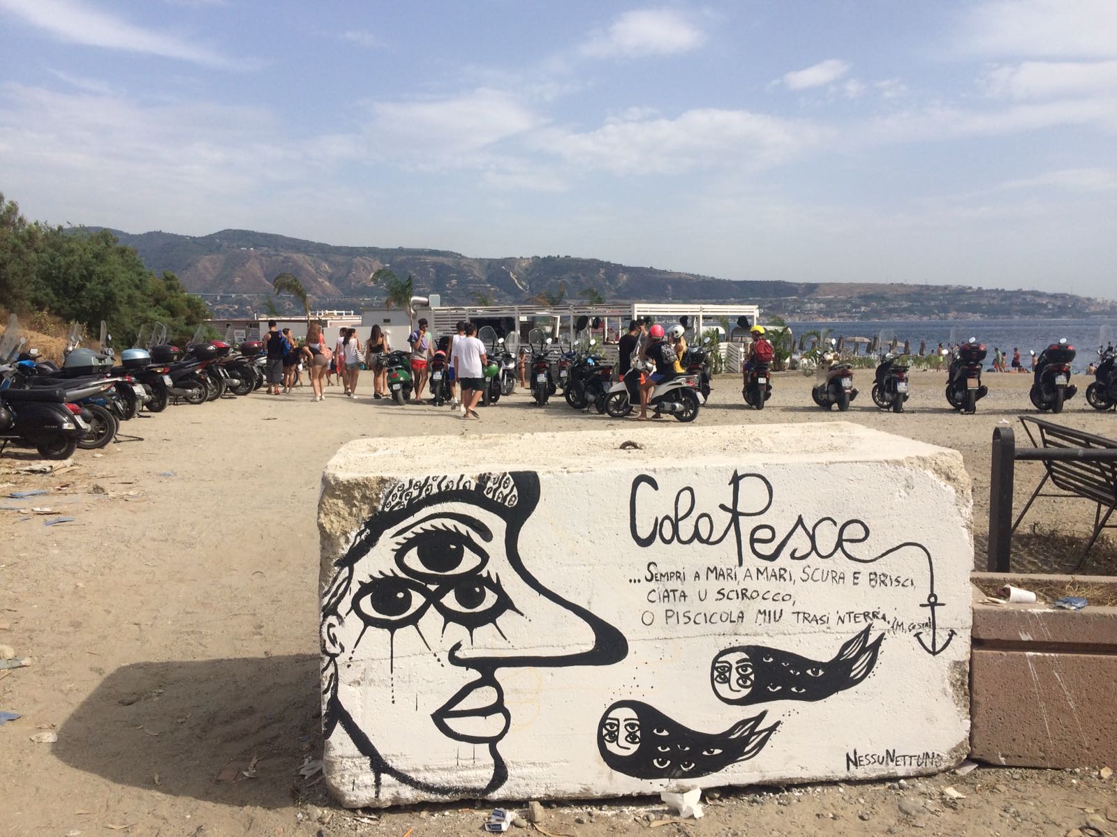“Essendo convinto che quell’area debba restare libera senza che si renda necessaria una simile azione, volevo porre l’accento sulla questione trasformando quel masso in un’opera che si potesse conciliare col territorio, anzi raccontarlo”. Infatti la storia che NessuNettuno ha deciso di evocare è quella di Colapesce, l’uomo che, sotto il mare dello Stretto, regge il peso della Sicilia.