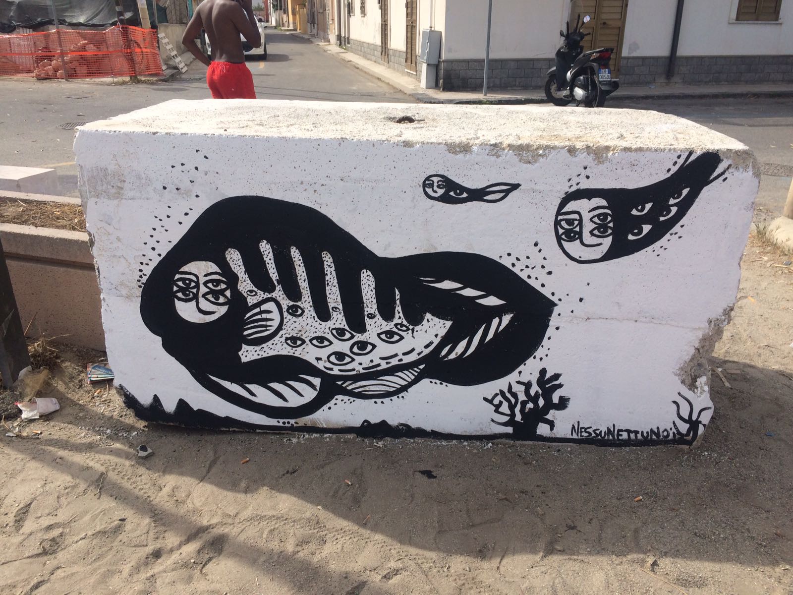 L’opera in questione non è ancora finita, ma se siete fortunati potrete trovare l’artista al lavoro sulla pietra della discordia. La pietra che, bella o brutta, utile o inutile, comunque è lì per ricordarci, ancor di più dopo il tocco di NessuNettuno, che sono i cittadini a dovere, per primi, sobbarcarsi il peso della gestione del proprio ambiente, e quindi della propria identità.