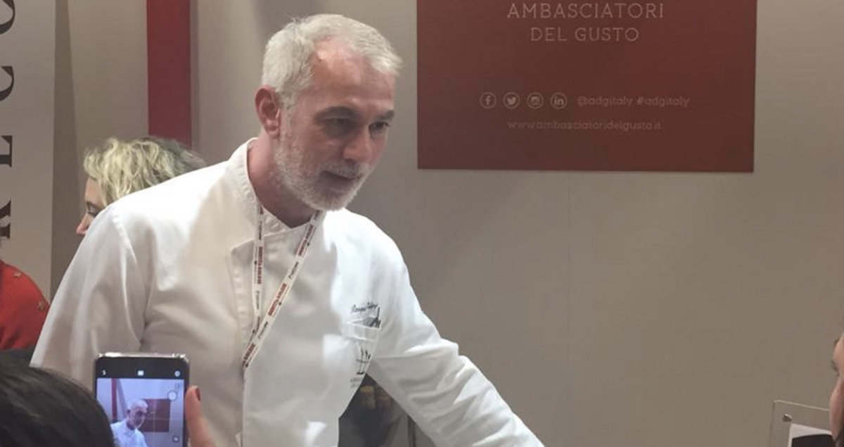 Nello spazio degli Ambasciatori Del Gusto il pubblico assaggia l’uovo di “Silvio” ottenuto da galline di tazza siciliana allevate allo stato libero da Silvio Ontario. Gli ingredienti sono semplici e sprizzano tutti di terra siciliana: ricotta di pecora, acqua di mare, grano antico e bottarga di tonno rosso. Articolata la preparazione ottenuta cuocendo l’uovo a bassa temperatura (64 gradi ) per un ora in un bagno termostatico. Caliri, che ama le tecniche di cucina moderna, spiega che la cottura al Roner appunto garantisce un equilibrio perfetto tra tuorlo ed albume regalando un testura perfetta. La ricotta viene montata insieme a dell’acqua di mare microfiltrata e batteriologicamente pura all’interno di un sifone per panna.