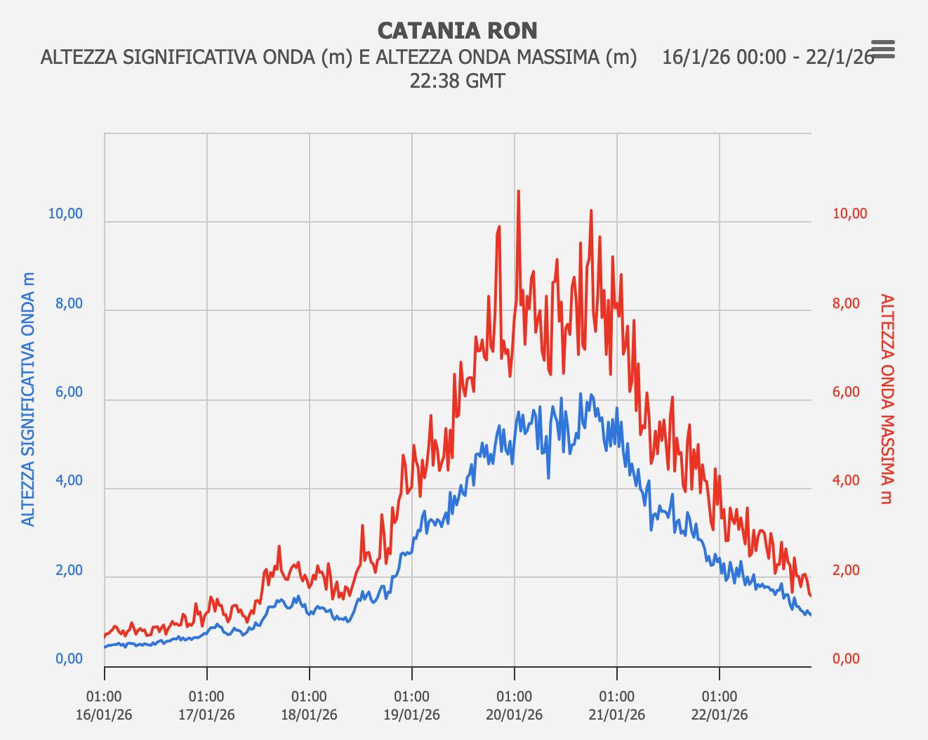 Il primo dei dati fuori scala è dell‘Ispra, istituto superiore per la protezione e la ricerca ambientale, che nella stazione di rilevamento al largo tra Portopalo di Capo Passero e l’isola di Malta ha registrato un’altezza d’onda massima di 16,66 metri, la più elevata osservata nel Mar Mediterraneo da quando esistono i rilevamenti. Non hanno scherzato nemmeno i rilevamenti più vicini: la boa oceanografica posizionata a 4 km al largo della spiaggia della Playa, a Catania, ha fatto segnare un’altezza massima di onda di 10,69 metri all’1 di notte del 20 gennaio, e poi un’altra di 10,25 metri lo stesso giorno, ma alle 18: per tutta la giornata, l’altezza massima delle onde si è mantenuta costantemente sopra i nove metri. Quasi tutto il giorno 20, l’altezza significativa delle onde è stata di 6 metri (cioè la media del 33% delle onde più alte in un determinato gruppo di onde). L’altezza massima (misura la distanza verticale tra la cresta più alta e il cavo più profondo registrati in un determinato intervallo di tempo. Altri rilevamenti danno, tra il 20 ed il 21 valori ondametrici di addirittura 14,49 metri.