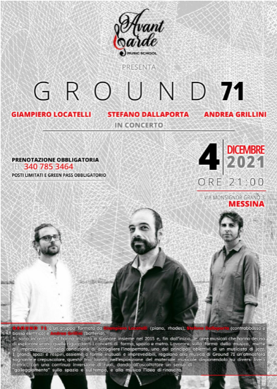 Si parla di Jazz all’Avant Garde Music School di Messina dove sabato 4 Dicembre alle ore 15:00 i Ground 71 (Giampiero Locatelli ,pianista, Stefano Dallaporta, contrabbassista e Andrea Grillini, batterista) vi aspettano per la dedicata Masterclass Galleggianti sul Tempo-metro ed armonia in divenire nell’atto improvvisatorio. Una giornata all’ insegna della buona musica che si concluderà con concerto, aperitivo e jam session a partire dalle ore 21:00 all’Auditorio Avantgarde in via Mons.Grano 7.