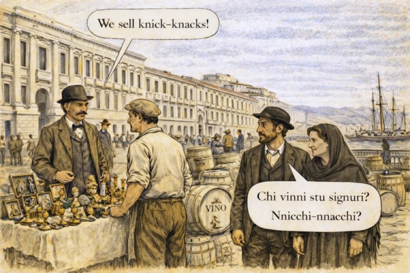Esiste una parola inglese che era molto usata nell’800 che individuava oggetti di piccola fattura, molto diffusi, che venivano chiamati knick-knacks. I knick-Kacks potevano anche essere pregevoli, ma la maggior parte delle volte erano oggetti comuni: minuterie, bamboline, piccole statuette, portacandele, scatoline, piccole stampe, oggetti carini certo, ma niente di particolarmente importante o costoso. Knick-Knacks, in inglese, si pronuncia senza la K e suona nick-nacks. In siciliano questa parola non è usata soltanto come interrogativa, come sarebbe la frase in latino. Sarà capitato anche a voi di sentir dire “basta cu sti nnicchi-nnacchi”, cioè “basta con queste sciocchezze”, passiamo alle cose importanti. Nella frase affermativa apparirebbe più chiaramente che nnicchi-nnacchi si riferisca a degli oggetti di poco valore, e che la frase non nasca da una domanda in latino.