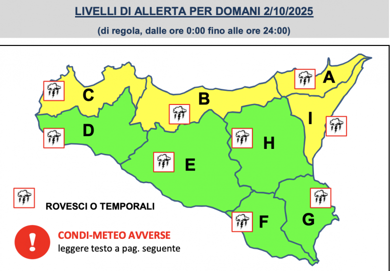 MESSINA. Mentre nel resto della Sicilia la situazione meteo tornerà alla normalità, Messina e la sua provincia, sia ionica. he tirrenica, domani giovedi 2 ottobre rimarranno in allerta gialla. Particolare attenzione la Protezione civile regionale la riserva alla riviera tirrenica, in cui potrebbero verificarsi intensi fenomeni di precipitazioni a prevalente carattere di rovescio o temporale, accompagnati da grandinate improvvise e tempeste di fulmini. Attenzione anche ai venti, previsti da forti a burrasca dai quadranti settentrionali, con ulteriori raffiche fino a burrasca forte sui rilievi e sui settori ionici