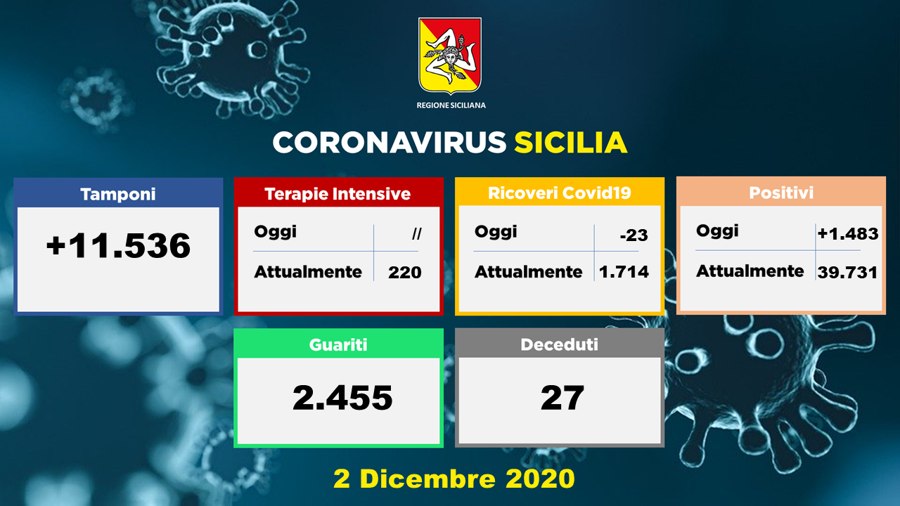 I contagi sono così ripartiti tra le nove province siciliane: Palermo 390, Catania 621, Messina 242, Ragusa 42, Trapani 70, Siracusa 60, Caltanissetta 52, Enna 6, Agrigento 0.