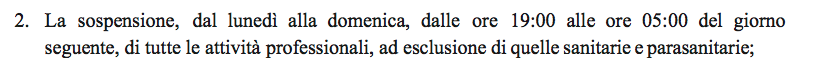 Un provvedimento molto controverso, e che sarà fonte di fraintendimenti, riguarda la previsione di chiusura non solo le attività commerciali, ma anche di tutte quelle professionali, ad eccezione delle sole professioni sanitarie e parasanitarie. È però previsto, qui l’inghippo, che le attività professionali, commerciali e artigianali possano restare aperte anche dopo la chiusura, purché senza contatto con il pubblico e non in presenza di clientela.