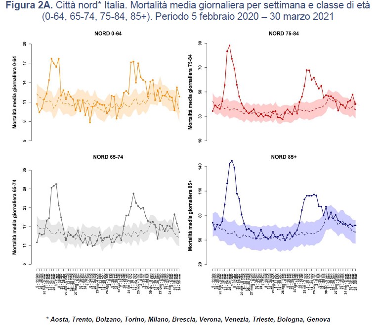 NOTA. La mortalità giornaliera (deceduti e residenti nel Comune) viene confrontata con la serie storica di riferimento (valore atteso). Per ogni città, la mortalità giornaliera attesa è definita come la media per giorno della settimana e numero della settimana calcolata nei 5 anni precedenti e pesata per la popolazione residente (dati Istat) per tenere conto del progressivo invecchiamento della popolazione.