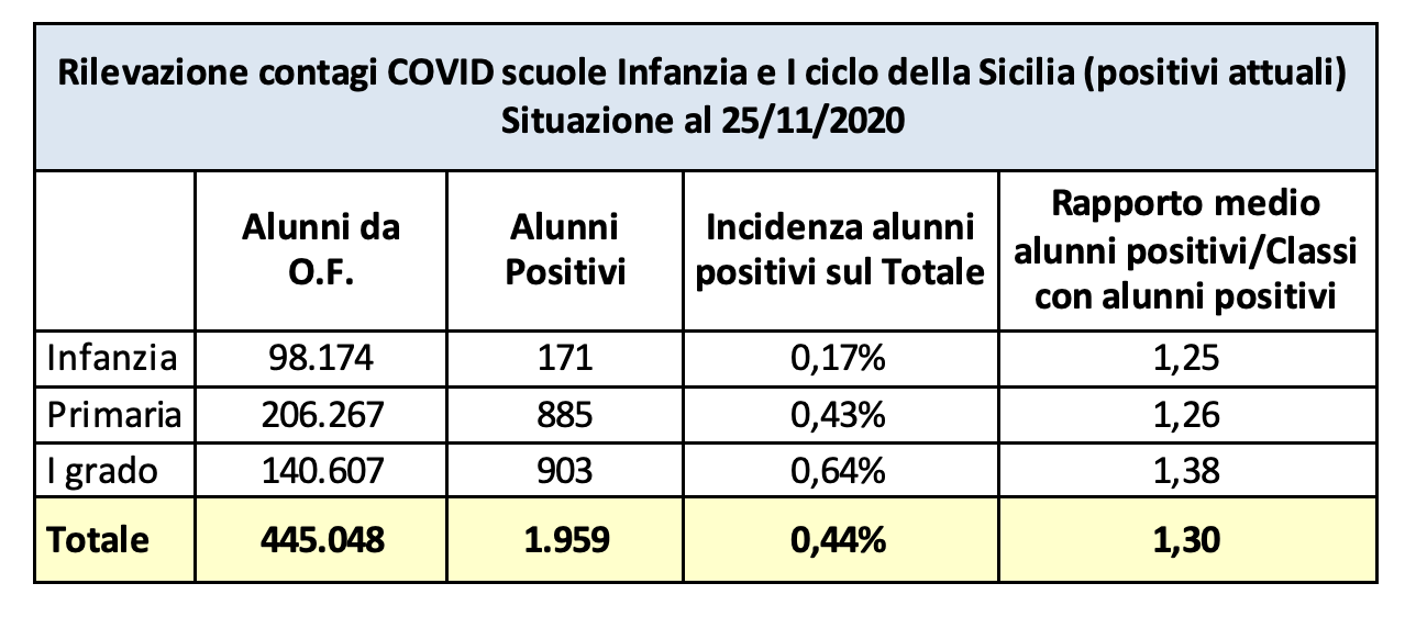 PALERMO. Sono in tutto 1.959 gli studenti siciliani risultati positivi al coronavirus su 445.048 iscritti in tutta la regione. Questi i numeri del report dell’Ufficio Scolastico Regionale che ha preso in esame il 96% egli istituti scolastici siciliani (557 tra asili, elementari e medie) con dati aggiornati al 25 novembre. L’incidenza totale del contagio è dello 0,44%, stessa percentuale di contagio delle scuole messinesi (di città e provincia), ma che risulta in leggero calo rispetto a una settimana fa. A Messina città, una settimana fa, il valore era della metà esatta, 0,22. Nonostante questo, il sindaco Cateno De Luca ha emanato un’ordinanza di chiusura delle scuole per sette giorni, prorogata ieri per un’altra settimana.