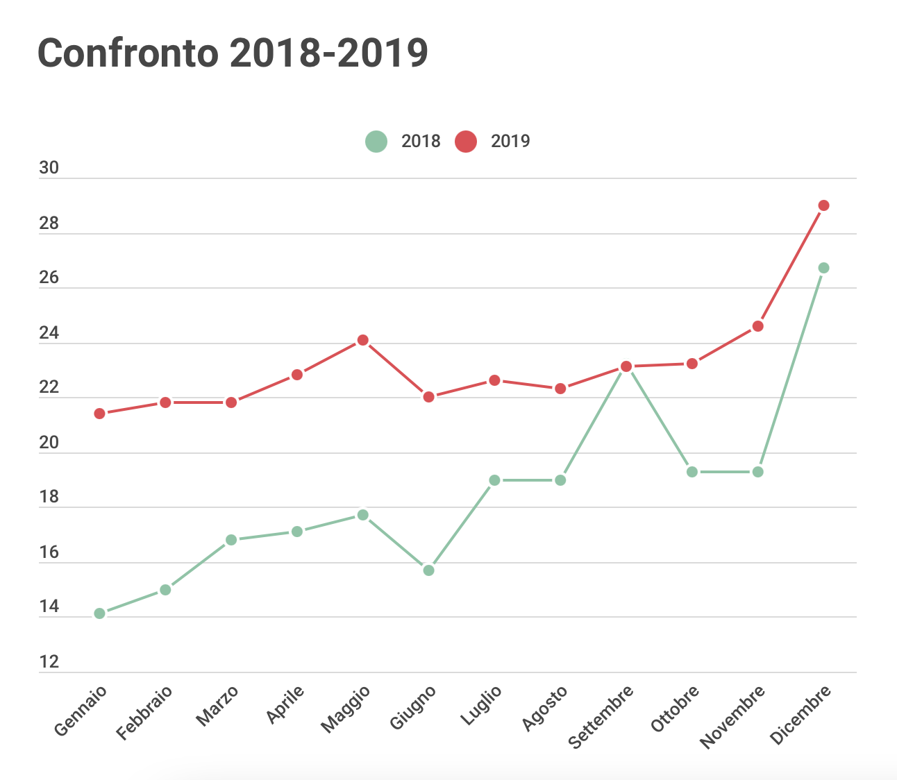 Il 2019 non vede per tutto l’anno nemmeno il traguardo minimo imposto da De Luca, quello del 30% a luglio, mese in cui la differenziata si attesta a poco più del 22%. E lo stesso traguardo si rivelerà una chimera per tutto il prosieguo dell’anno, dato che non solo la media, ma persino i parziali mensili al 30% non ci arriveranno mai (figurarsi al 65%). Addirittura, dopo il picco di maggio 2019, ci sono cinque mesi di calo con una decrescita fino al -2,1%. Proprio nel penultimo mese dell’anno la situazione sembra riprendersi (a novembre 24,60%) fino a dicembre, quando il tasso di raccolta differenziata raggiunge il 29% mensile: un’impennata che si era registrata anche nel 2018, e che coincide in parte anche con l’esigenza di raggiungere il “monte differenziata” necessario ad ottenere lo sconto per la Tari.