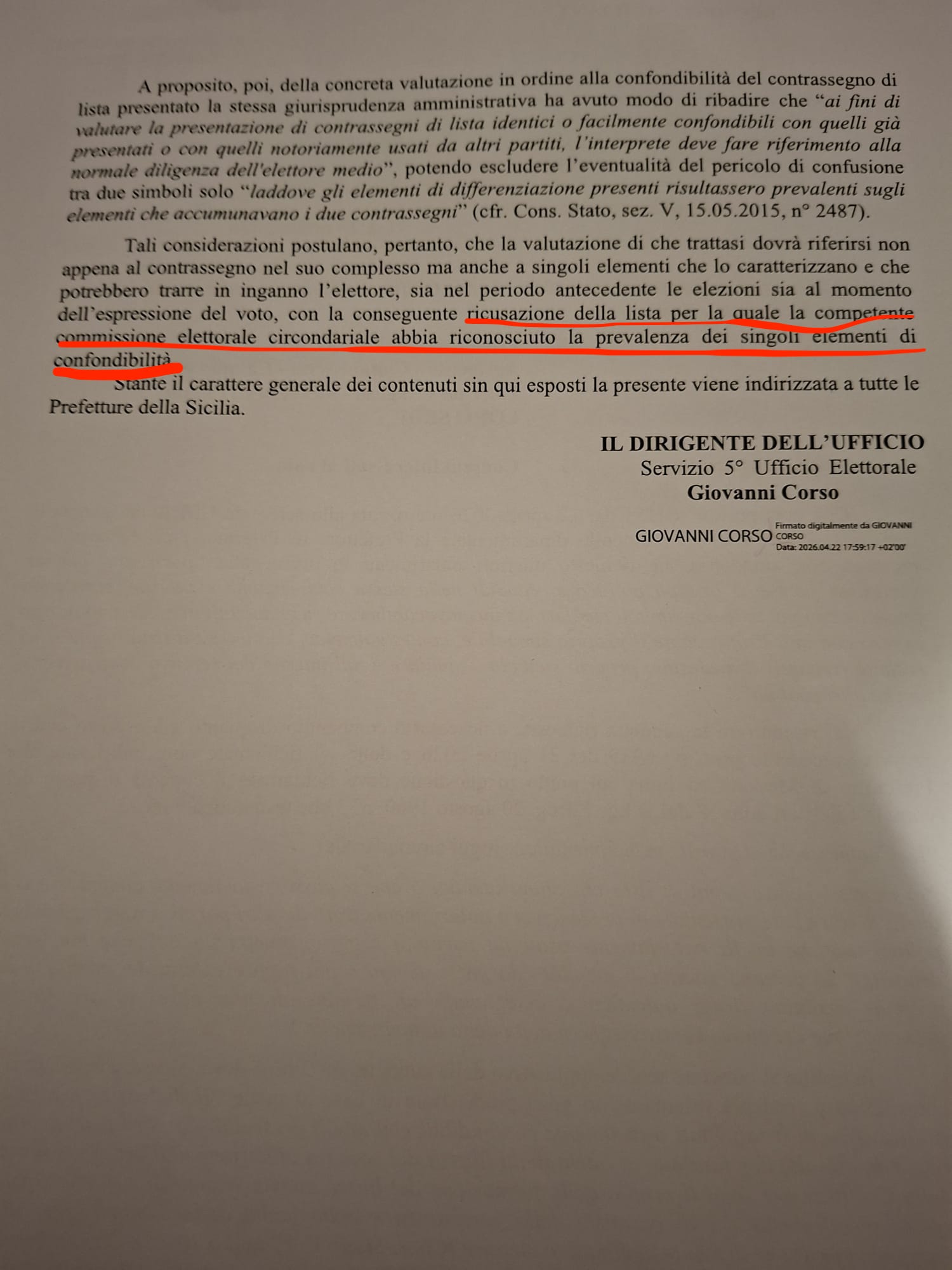 “Tali considerazioni postulano, pertanto, che la valutazione di che trattasi dovrà riferirsi non appena (sic) il contrassegno nel suo complesso, ma anche a singoli elementi che lo caratterizzano e che potrebbero trarre in inganno l’elettore, sia nel periodo antecedente le elezioni sia al momento dell’espressione del voto, con la conseguente ricusazione della lista per la quale la competente commissione elettorale circondariale abbia riconosciuto la prevalenza dei singoli elementi di confondibilità”, conclude il dirigente regionale.