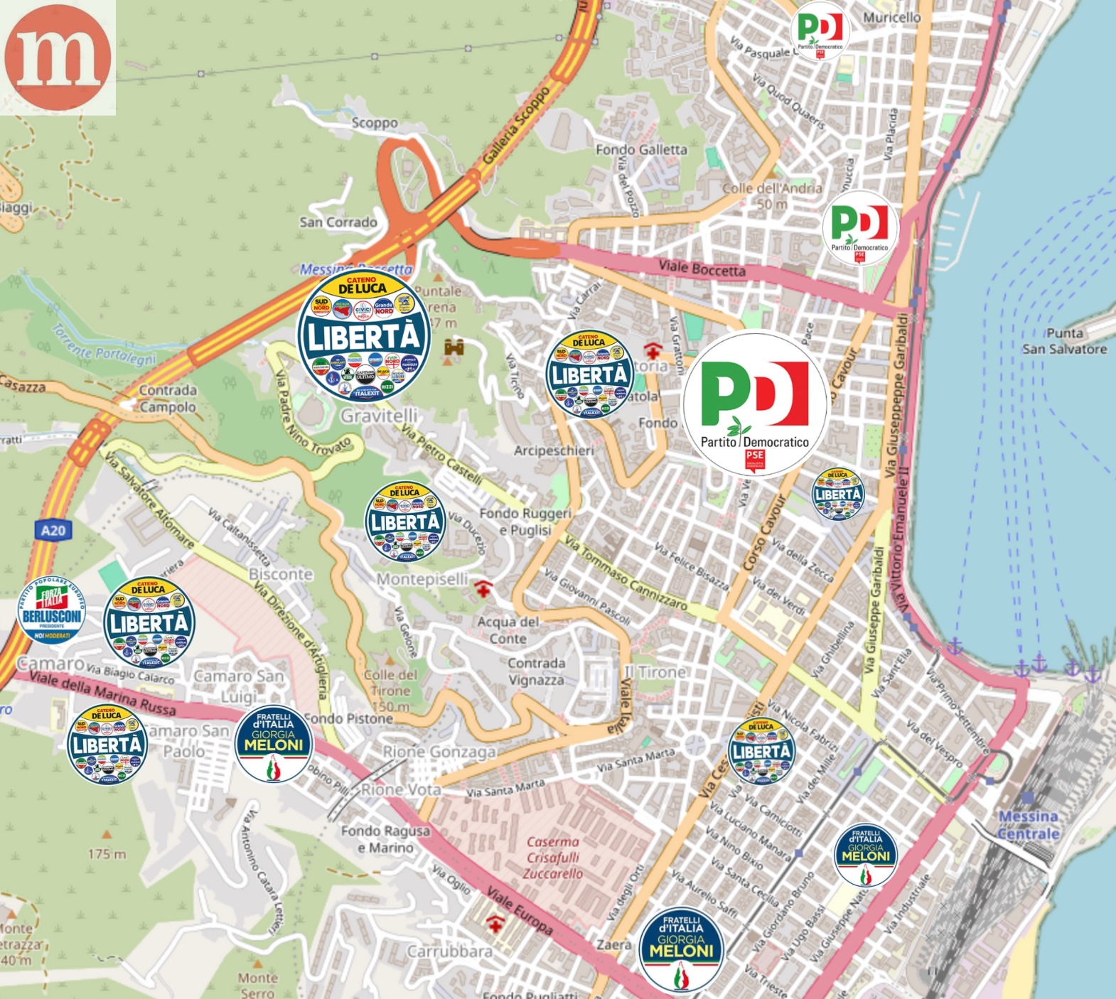 Nel territorio grossomodo corrispondente al secondo quartiere, c’è un po’ più di fermento: la Lega si afferma a San Filippo superiore, sezione 232, e Fondo Fucile, sezione 233 e 239, e la dorsale del torrente Gazzi per Libertà è stata piuttosto complicata: la sezione 56 ha visto trionfare, di parecchio, Fratelli d’Italia, mentre nella 62 e nella 64 fa il pieno Forza Italia. Si tratta della scuola Ferraù di rione Aldisio. Fratelli d’Italia vince anche nella sezione 251, al seggio allestito presso il Policlinico. Altrove è un tripudio di voti la la lista di De Luca.