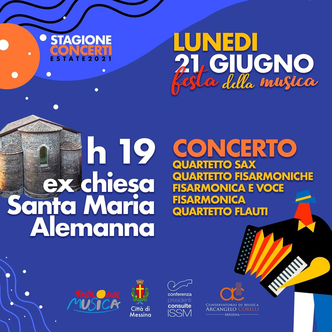 MESSINA. Nell’ambito della 𝗦𝘁𝗮𝗴𝗶𝗼𝗻𝗲 𝗖𝗼𝗻𝗰𝗲𝗿𝘁𝗶 𝗘𝘀𝘁𝗮𝘁𝗲 𝟮𝟬𝟮𝟭, il Conservatorio Corelli ha organizzato, in occasione della festa della Musica, sette eventi musicali, che si svolgeranno oggi, a partire dalle 18, in varie location di Messina: Teatro Vittorio Emanuele, Chiesa dell’Arcivescovado, Chiesa ex S. Maria Alemanna, Basilica Santuario S. Antonio, Monte di Pietà, Lido Horcynus Orca e Terrazza INPS.
