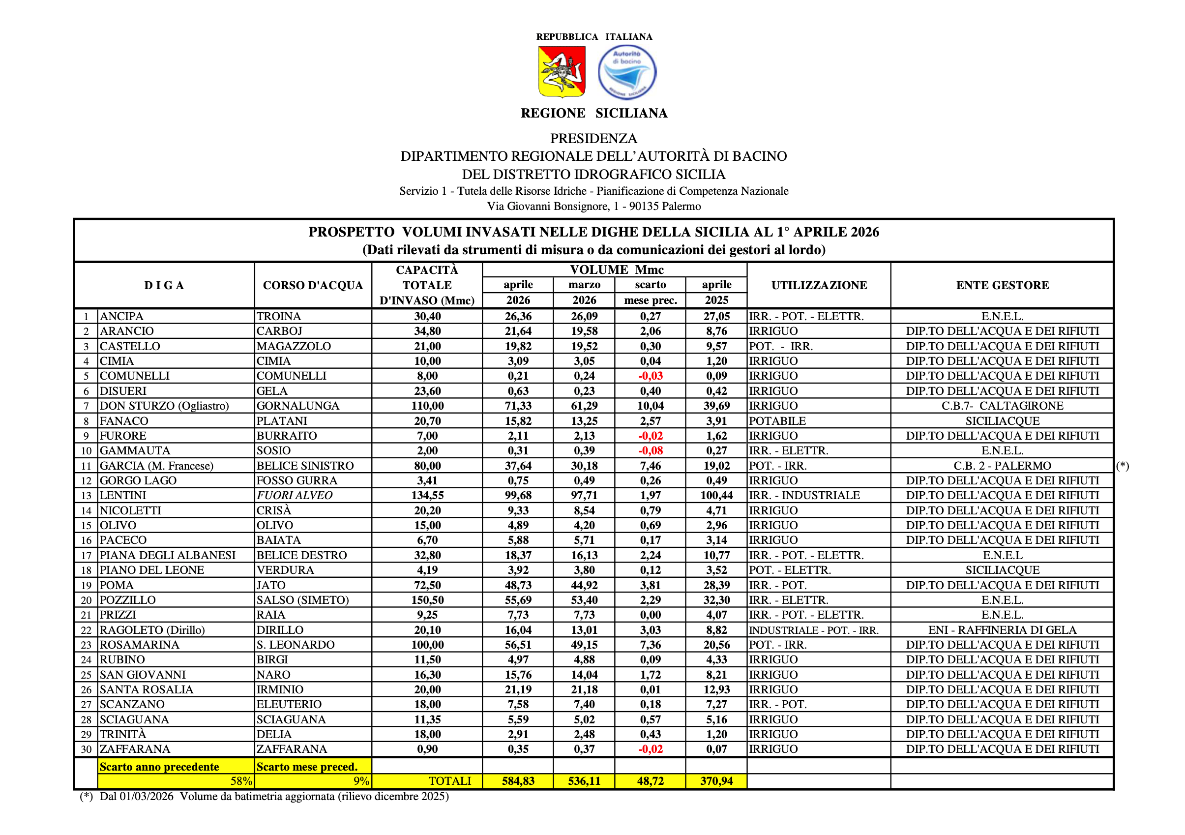 Tra le dighe che hanno accumulato uno scarto positivo maggiore invece c’è quella di Don Sturzo che ha registrato un aumento di volume di 10,04 mmc raggiungendo i 71,33 mmc sui 110 milioni disponibili. La stessa diga ad aprile 2025 aveva raccolto solo 39,69 mmc di acqua. Situazione favorevole anche per la diga di Rosamarina del corso d’acqua San Leonardo che su 100mmc di capienza ha racimolato 56,51 milioni di metri cubi d’acqua con uno scarto di 7,36 mmc rispetto a marzo e il 35% in più rispetto ad aprile 2025. Situazione positiva ancora anche per la diga di Garcia del corso Belice Sinistro la cui acqua ha anche scopo potabile e che al momento è occupata per il 47% della sua totalità (37,64 mmc su 80) contro lo stesso periodo l’anno scorso, quando era occupata per il 23,78%.