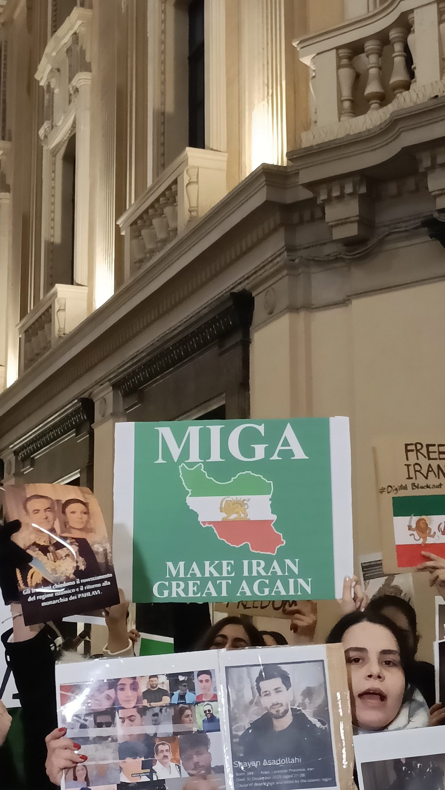 Tra i molti slogan, spiccavano quelli in favore dell’ultimo Scià di Persia Reza Pahlavi, spodestato dalla rivoluzione islamica del 1979 che ha portato gli Ayatollah al potere, e del figlio, il principe Raza Pahlavi (stesso nome del padre): tra gli altri, anche cartelli con lo slogan MIRA, Make Iran Great Again, sulla falsariga del movimento Maga (Make America Great Again) del presidente statunitense Donald Trump.
