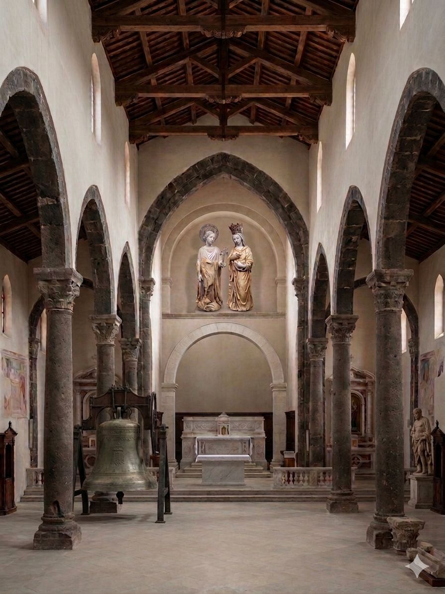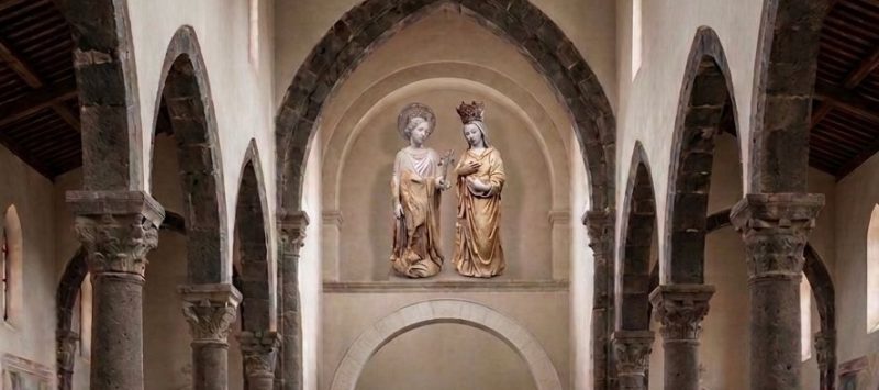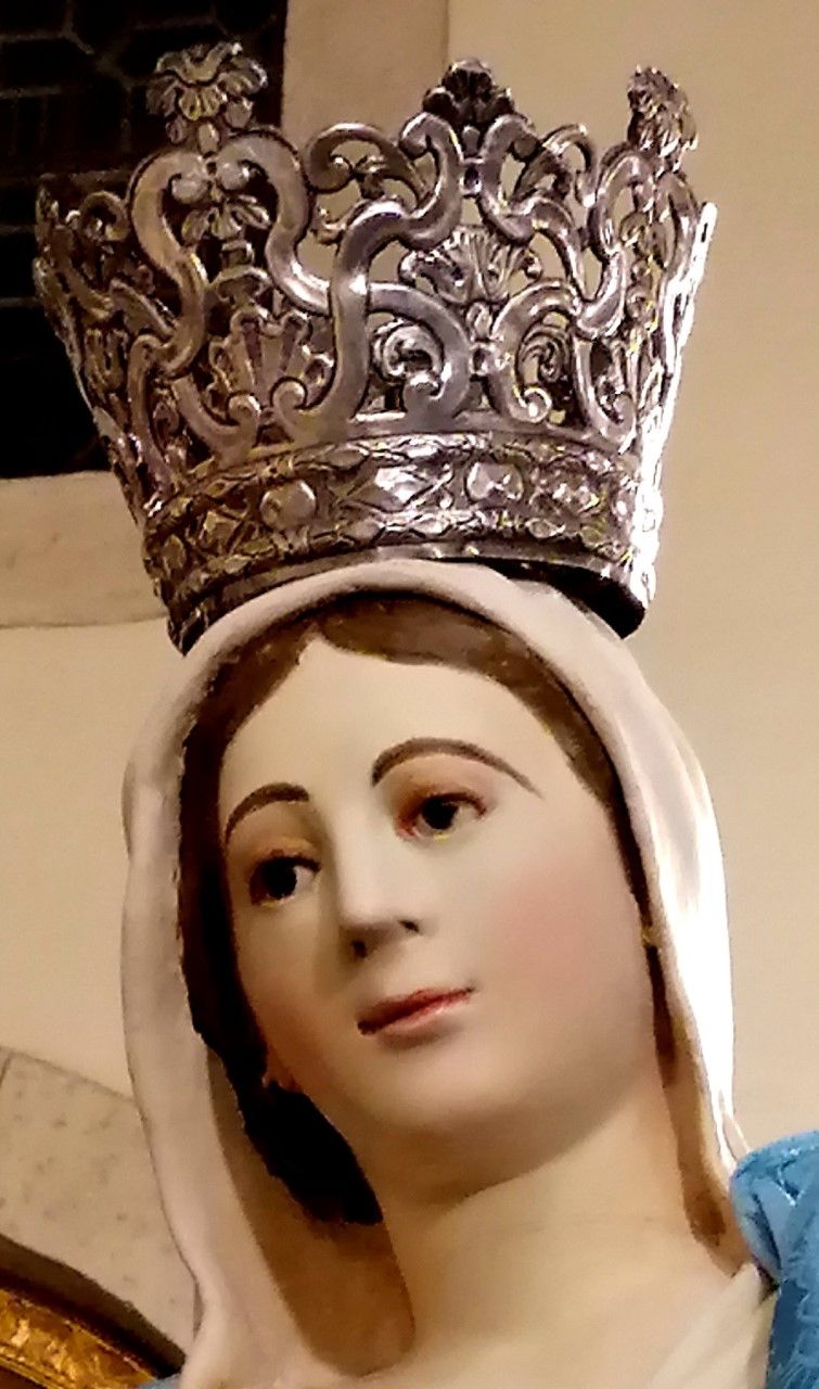 Attraverso i reperti fotografici, le notizie storiche e i frammenti del passato, ho voluto “giocare” con l’intelligenza artificiale. Dopo molte correzioni, mantenendo saldo il timone della ricerca, ho elaborato tre immagini che ricostruiscono l’aspetto del convento, l’interno della chiesa e il pregevole gruppo marmoreo, reintegrato delle parti mancanti con una comparazione critica con le opere firmate dal Freri e l’aggiunta degli argenti che oggi adornano la nuova statua lignea, forse gli stessi menzionati nel 1666. Foto in basso