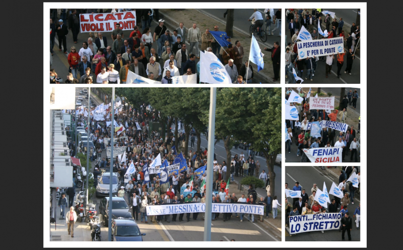 Sarebbe la prima manifestazione a favore del ponte in diciannove lunghi anni. Perchè ’unico evento a favore del ponte sullo Stretto, a Messina si è tenuto a giugno del 2006, ma l’hanno organizzato… i catanesi. Era ancora bello vivo il ricordo dei trentamila sfilati qualche mese prima, a gennaio, per dire no al ponte, quando l’Mpa dell’allora presidente della Regione Siciliana Raffaele Lombardo aveva chiamato a raccolta grossa parte dei circoli del Movimento per l’autonomia in giro della Sicilia, da Paternò a Melilli, da Licodia Eubea a Barrafranca, con tanto di sindaci di area di governo, quindi centrodestra (prima del ribaltone in seguito al quale la maggioranza di Lombardo sarà di centrosinistra) in fascia tricolore ad accompagnare i big Totò Cuffaro (predecessore a Palazzo d’Orleans di Lombardo), Francesco Musotto e Vincenzo Fontana (presidenti della Provincia di Palermo ed Agrigento), Umberto Scapagnini (sindaco di Catania) e un giovane Cateno De Luca neoeletto all’Ars proprio nelle file del Mpa e, all’epoca, assatanato pontista (con al seguito un nutrito numero di iscritti ai circoli Fenapi, con tanto di striscioni), mentre i parlamentari messinesi hanno dato pura testimonianza di sé e poi sono spariti, con la fragorosa assenza dei rappresentanti istituzionali di palazzo Zanca e palazzo dei Leoni.