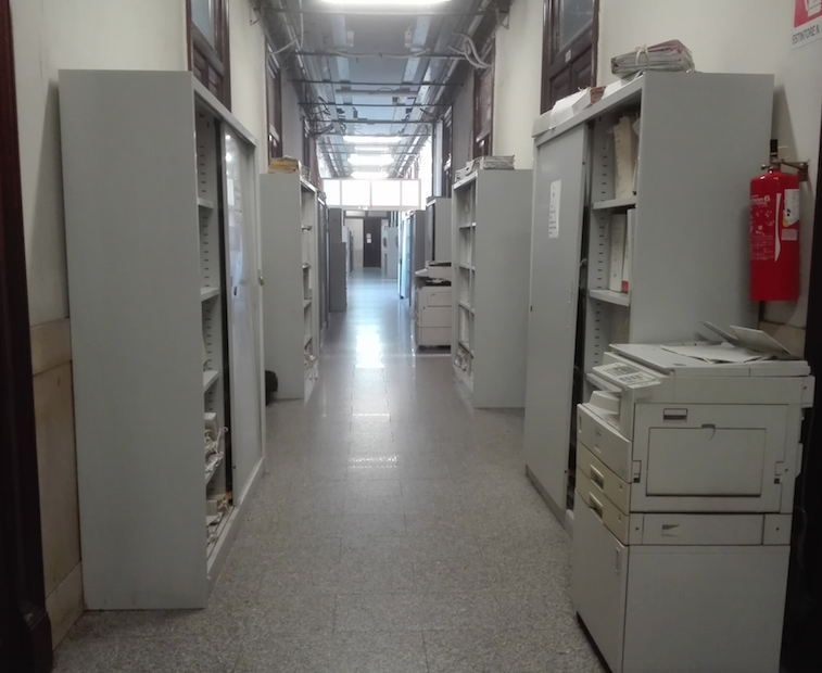 Scompaiono i marmi, e il colore dominante diventa il grigio ministeriale. Ai lati del corridoio, tra una porta e l’altra degli uffici, sono ammassati decine di armadi che contengono faldoni pieni di documenti: pochi sono chiusi, la maggior parte delle carpette è a vista e sistemata alla bell’e meglio. Lo spazio è quello che è, ma lo spettacolo, e l’atmosfera, è da pieno socialismo reale.