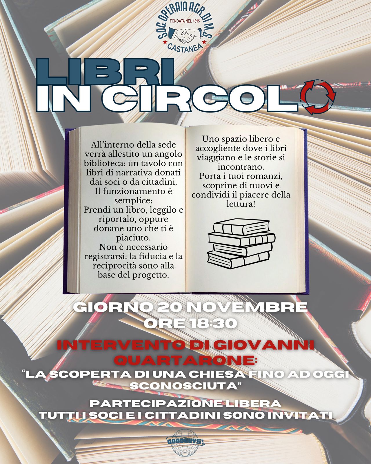«Come Società Operaia di Mutuo Soccorso di Castanea vogliamo finalmente dare più spazio alla cultura, cosa che in passato non siamo riusciti a fare quanto avremmo voluto. Per questo lanciamo una nuova iniziativa dedicata allo scambio dei libri: un modo semplice per condividere storie, idee e curiosità tra tutti noi – commenta il Presidente Carlo Rizzo – Crediamo che la cultura cresca quando circola, e niente la fa circolare meglio dei libri che passano di mano in mano. Vi invitiamo a partecipare, portare un libro, prenderne un altro e contribuire a un piccolo gesto che può creare grandi legami nella nostra comunità».