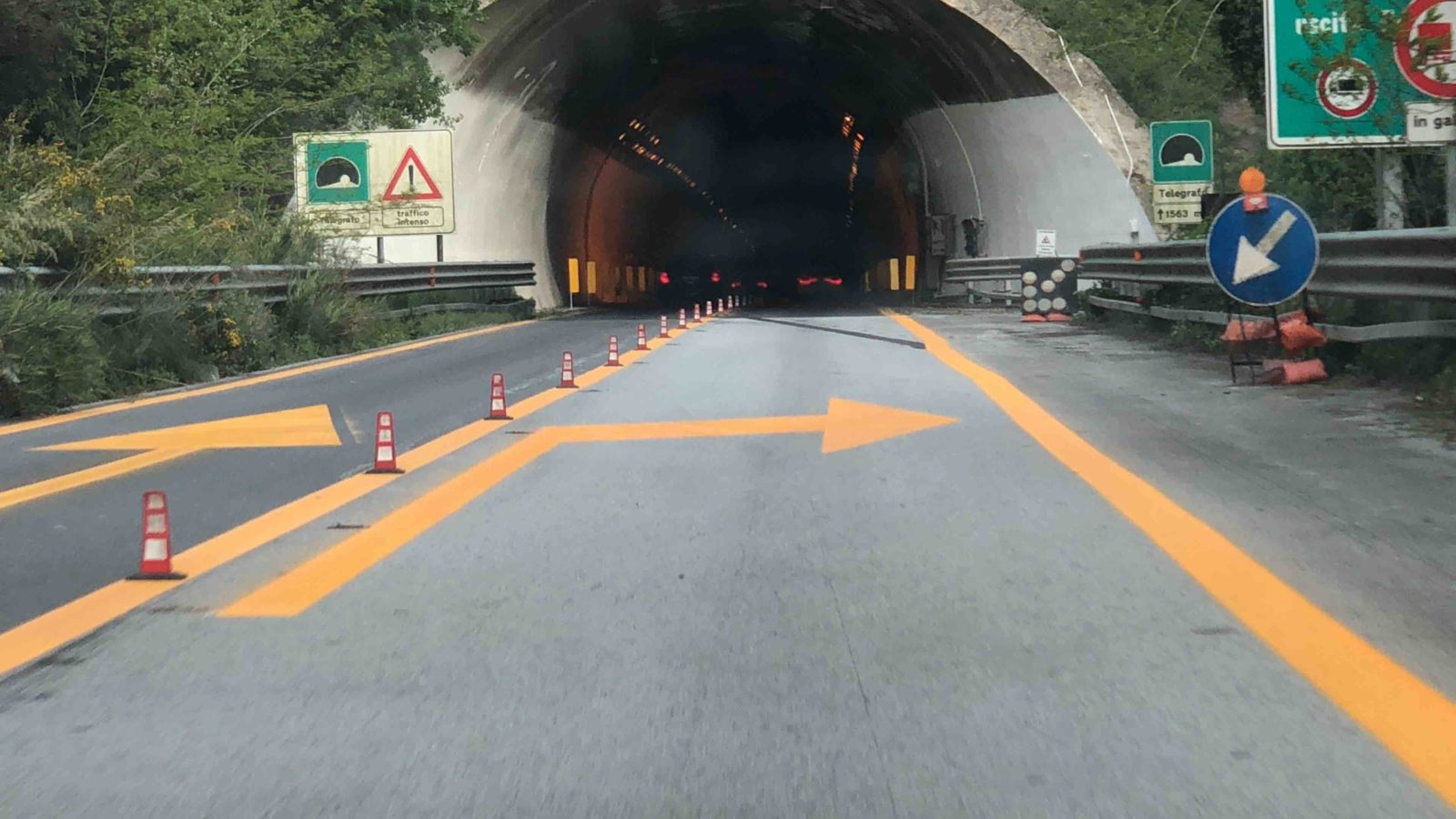 Durante le tre gallerie (Telegrafo, S. Michele e Baglio) che si susseguono prima di arrivare all’uscita per Giostra, infatti, il transito è stato riaperto su entrambe le corsie, ma vige il divieto di sorpasso (che comincia già dal ponte Bugolio). Proprio all’uscita dalla galleria Baglio ecco lo svincolo: un curvone a destra dove il limite di velocità iniziale è di 60 km/h, ma diventa, dopo circa 200 metri e fino alla fine della rampa, di 40 km/h.