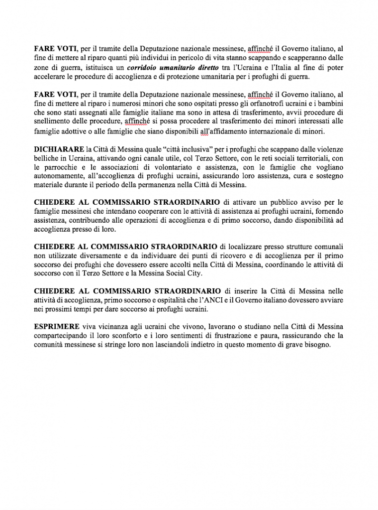 MESSINA. Una mozione di indirizzo per istituire – in sinergia con Anci e con le reti di Terzo Settore e governative — un corridoio umanitario che possa immediatamente accogliere i rifugiati in fuga dell’Ucraina. A protocollarla. sono i consiglieri del Pd Alessandro Russo, Felice Calabrò, Gaetano Gennaro e Antonella Russo, che chiedono inoltre la creazione di un albo delle famiglie includenti disposte ad accogliere famiglie o individui in fuga, con particolare riferimento ai bambini e ai soggetti vulnerabili. Fra le richieste anche l’accelerazione del processo di affidamento e adozione internazionale dei minori che possano essere in tal modo essere allontanati dalle zone di guerra per essere messi in salvo presso le famiglie messinesi.