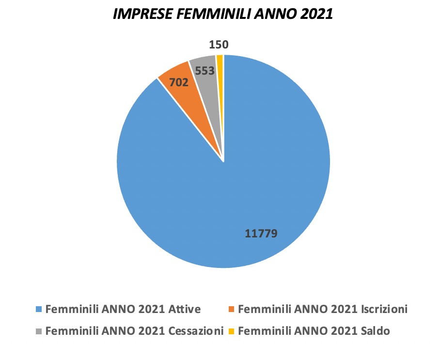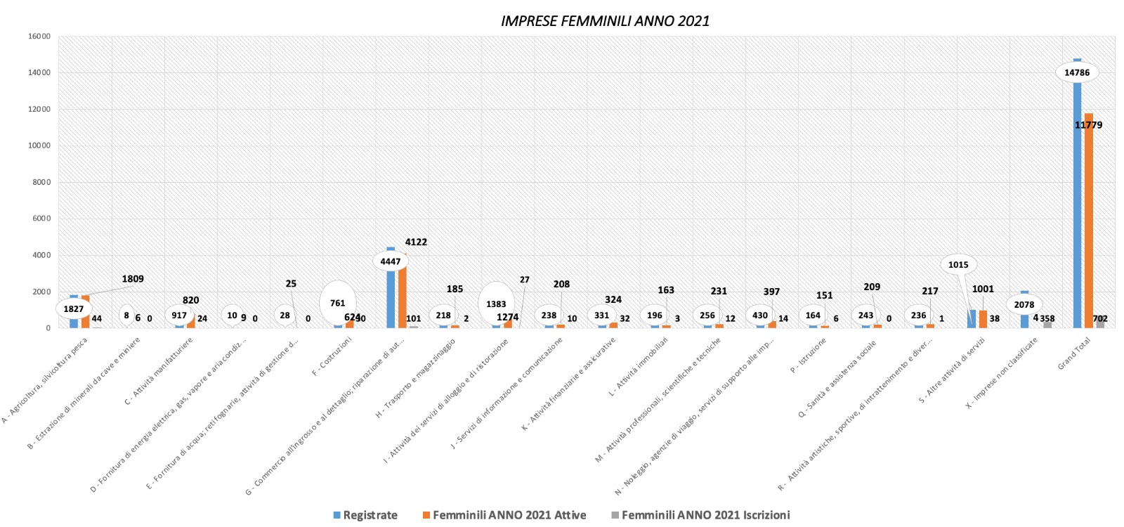 «Le imprese femminili in Italia hanno un notevole peso – aggiunge la segretaria generale dell’Ente camerale, Paola Sabella – nell’anno 2021, sono 1.342.703, più di 1/5 del totale delle imprese, con un tasso di femminilizzazione pari al 22,1%. L’incidenza del terziario sul totale delle aziende in rosa è pari al 66,8%. Sono concentrate, soprattutto, nei settori del Commercio, Turismo, Altre attività di servizi, Istruzione, Sanità e assistenza, Agricoltura. La crescita registratasi negli ultimi 5 anni è stata pari a +1,6%, ma la crisi pandemica ha interessato anche le imprese femminili, registrando una contrazione nel numero di iscrizioni: la variazione della percentuale delle iscrizioni negli anni 2020/2019 è pari a -21% e nel biennio 2021/2019 pari a -12%».