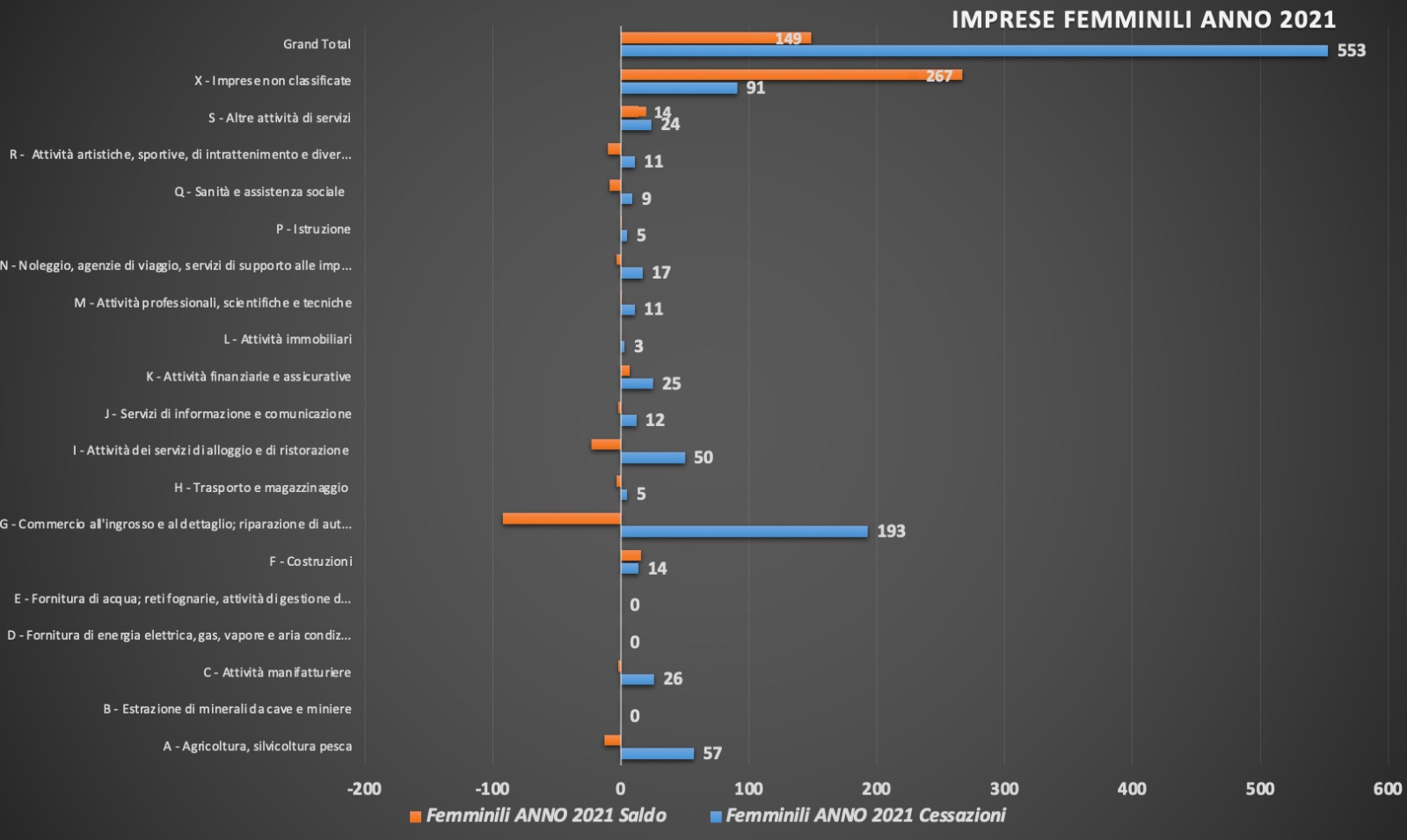 In tutti e tre i settori il saldo tra iscrizioni e cessazioni è, comunque, negativo: -92 nel Commercio; -13 Agricoltura, silvicoltura e pesca; -23 Attività dei servizi di alloggio e di ristorazione. Stessa cosa per gli altri settori, tutti chiudono il 2021 con un saldo tra aperture e chiusure negativo o pari a 0, ad eccezione per il settore delle Costruzioni (761 nel 2021, 720 nel 2020) dove si rileva un +16 (nel 2020, era -3), per quello delle Attività professionali, scientifiche e tecniche (+1 nel 2021, + 6 nel 2020), per Attività finanziarie e assicurative (+7 nel 2021, -4 nel 2020), per Istruzione (+1 nel 2021, – 4 nel 2020) e per Altre attività di servizi (+14 nel 2021, -11 nel 2020).
