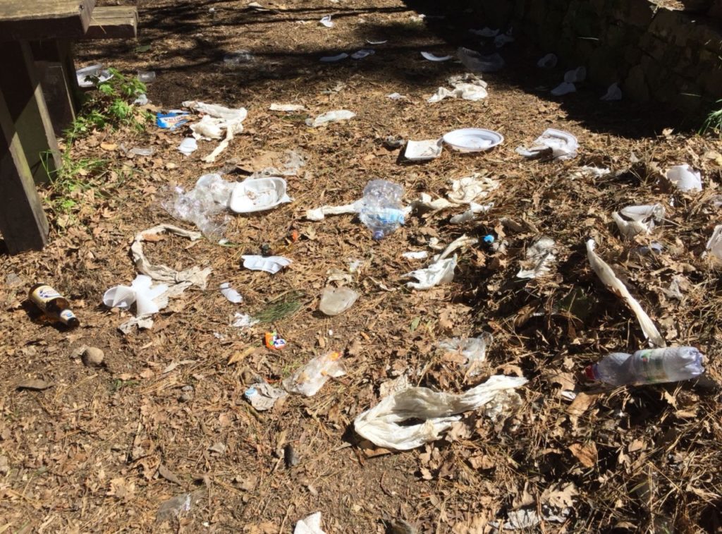 I primi residui della Pasquetta sono ben visibili già all’ingresso, con una ventina di buste bianche e nere accatastate – paradossalmente –  sotto a un cartello “ecologico” che invita a non sporcare. All’interno dell’area da picnic lo scenario poi è ancora più eloquente, con una distesa di ogni ben di Dio abbandonato a terra fra le panche, sui tavoli e a ridosso dei muretti che delimitano lo spazio.