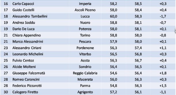 Accorinti è in buona compagnia: su 110 comuni capoluogo italiani, solo in 38 di essi i sindaci raggiungono la soglia del 55% di gradimento stabilita dall’istituto per entrare in classifica. Accorinti, non raggiungendola, non c’è entrato, come, per esempio, i primi cittadini delle due maggiori città italiane, Giuseppe Sala sindaco di Milano e Virginia Raggi sindaco di Roma, rispettivamente al 49° posto con il 54,3% e all’88° posto con il 44,4%.