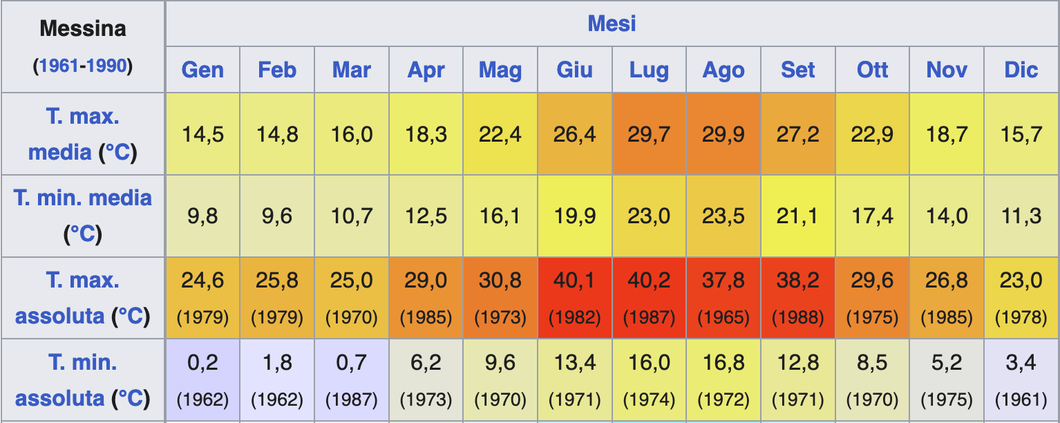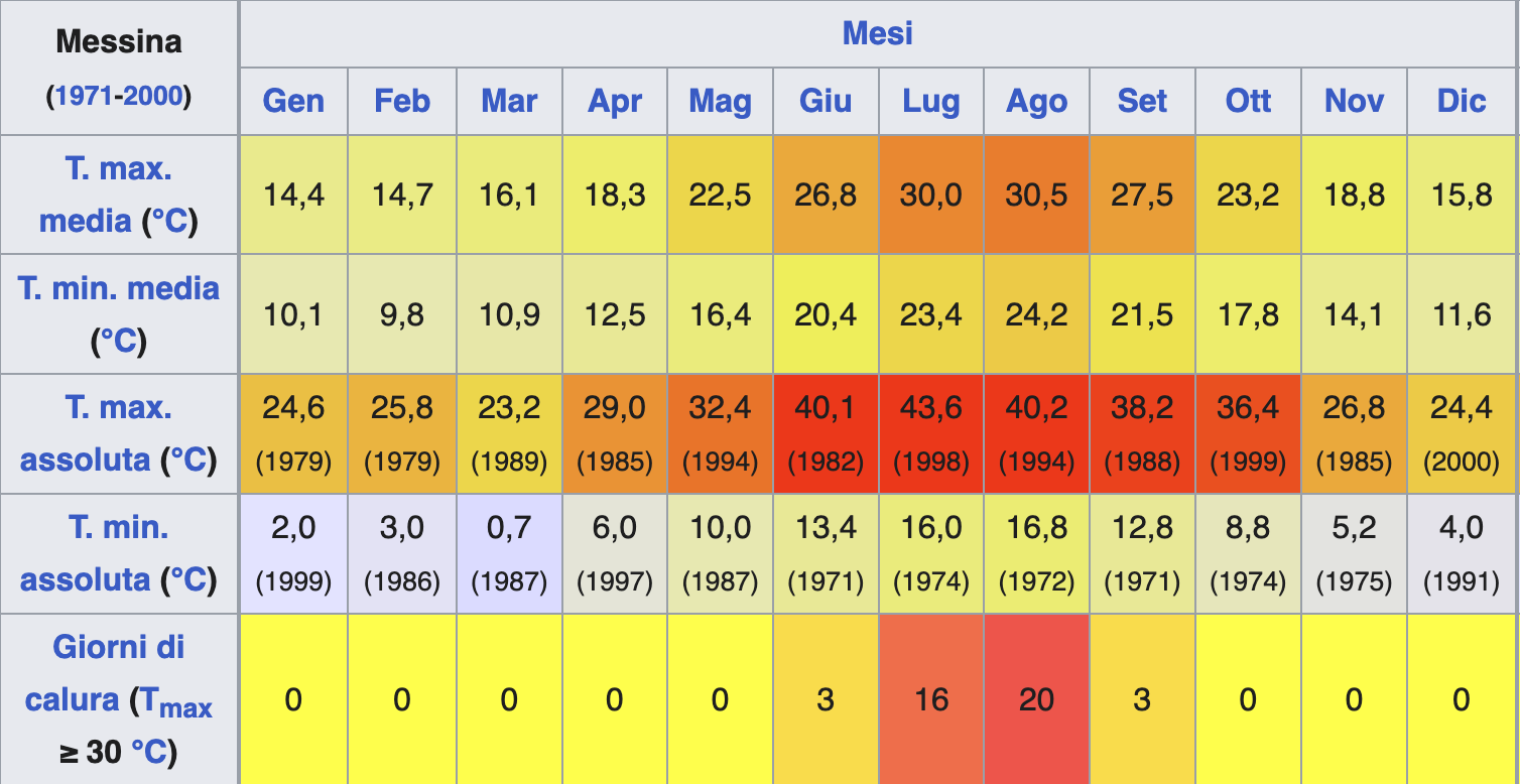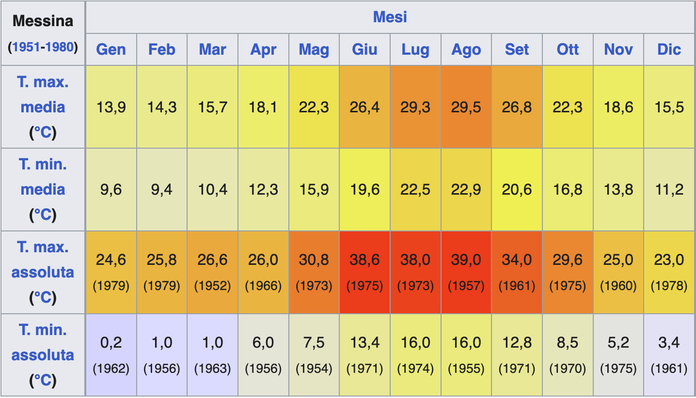 E in periodi più recenti? A misurare la temperatura cittadina è la stazione meteorologica di Messina, sorta nel 1909, che si occupa di rilevare i dati relativi a vari fenomeni, fra cui nuvolosità, precipitazioni, pressione atmosferica, direzione e velocità del vento, condizioni del mare.