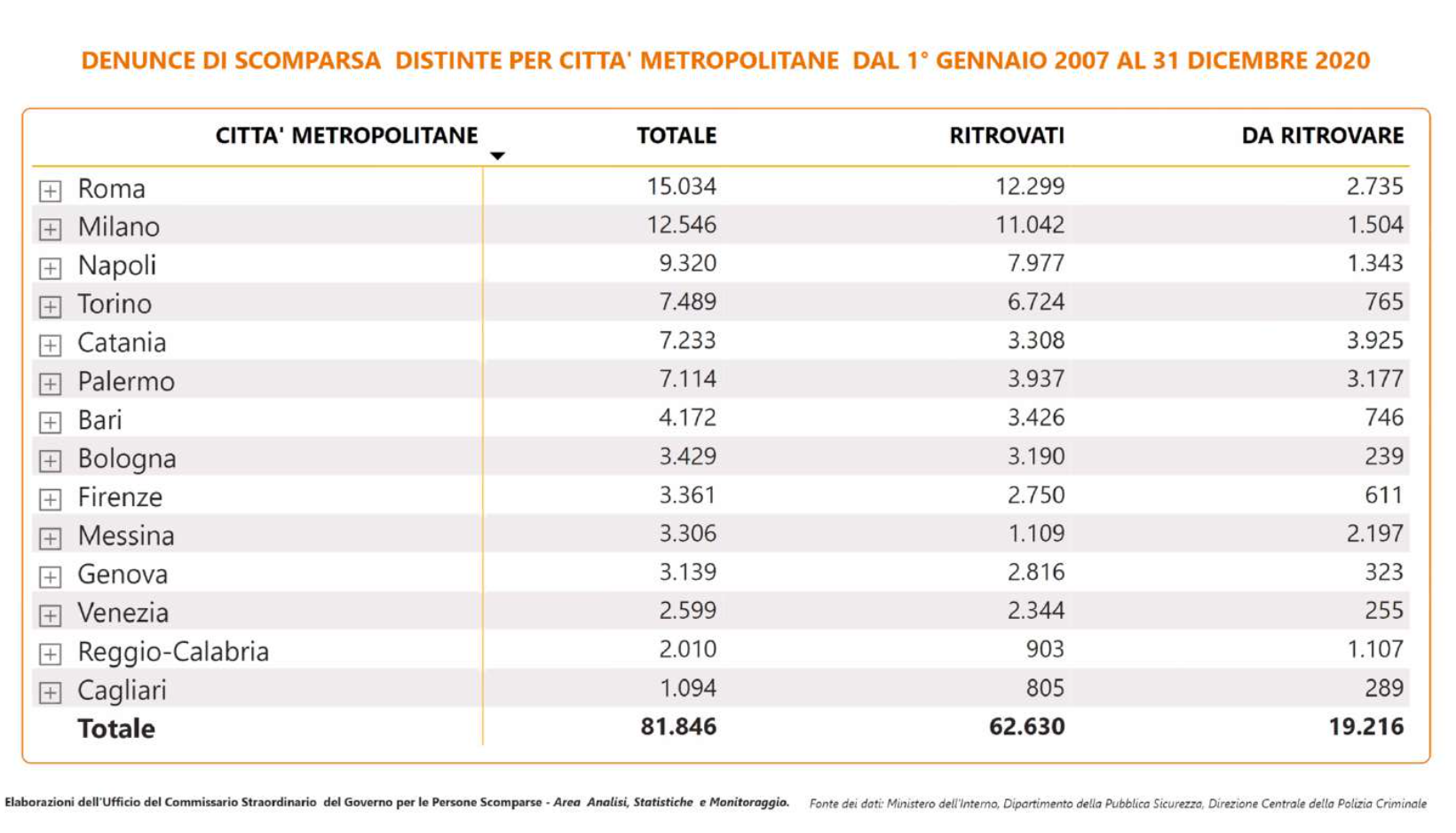 Quante denunce hanno portato a ritrovamenti? Su 3.306 denunce di scomparsa registrate in tutta la città metropolitane tra il 1 gennaio 2007 e il 31 dicembre 2020, il 33,5% hanno portato a ritrovamenti. Si parla di 1.109 persone ritrovate e 2.197 ancora da ritrovare.