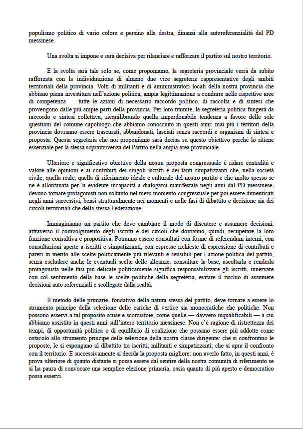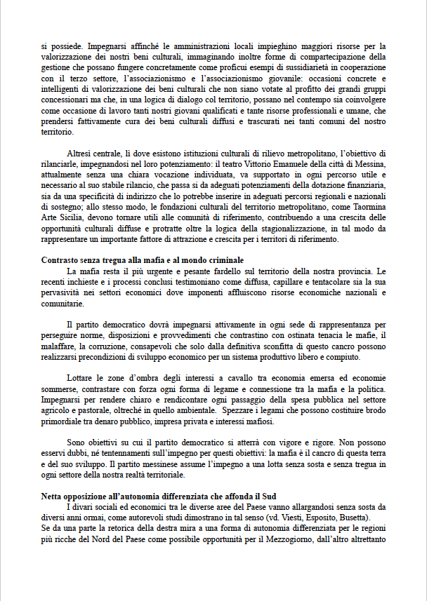 Nel documento vengono stilati i punti cardine da cui ripartire dopo la lunga fase di transizione del Pd, durante la quale “la sua azione politica, la sua riconoscibilità e la sua capacità di proposta nell’opinione pubblica messinese si sono lungamente e drammaticamente appannati“. «Il Partito messinese – si legge – ha subito negli ultimi anni una vera e propria maledizione, a onor del vero simile a quella vissuta da molte altre federazioni territoriali, che lo ha visto soccombere sotto il peso di uno scontro tra correnti molto acceso, sebbene per lungo tempo apparentemente mitigato da un unanimismo solo formale che avrebbe dovuto, sulla carta, assicurare una guida condivisa ma che in effetti ha nascosto uno scontro perenne, a bassa ma costante frequenza, tra posizioni politiche che rispondevano a logiche di corrente, di appartenenza e di convenienza politico — elettorale».