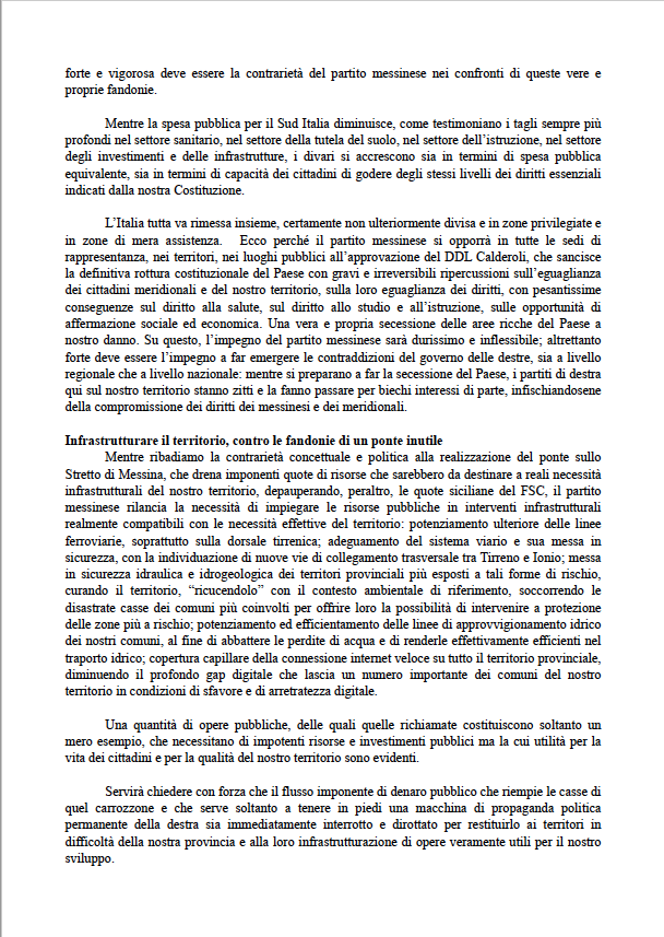 Si parla anche di Ponte e della “contrarietà concettuale e politica” alla realizzazione dell’opera, con l’intento di impiegare le risorse pubbliche “in interventi infrastrutturali realmente compatibili con le necessità effettive del territorio”, dal potenziamento ulteriore delle linee ferroviarie alla messa in sicurezza idraulica e idrogeologica dei territori provinciali più esposti a tali forme di rischio, dal potenziamento delle linee di approvvigionamento idrico alla copertura capillare della connessione internet veloce su tutto il territorio provinciale.