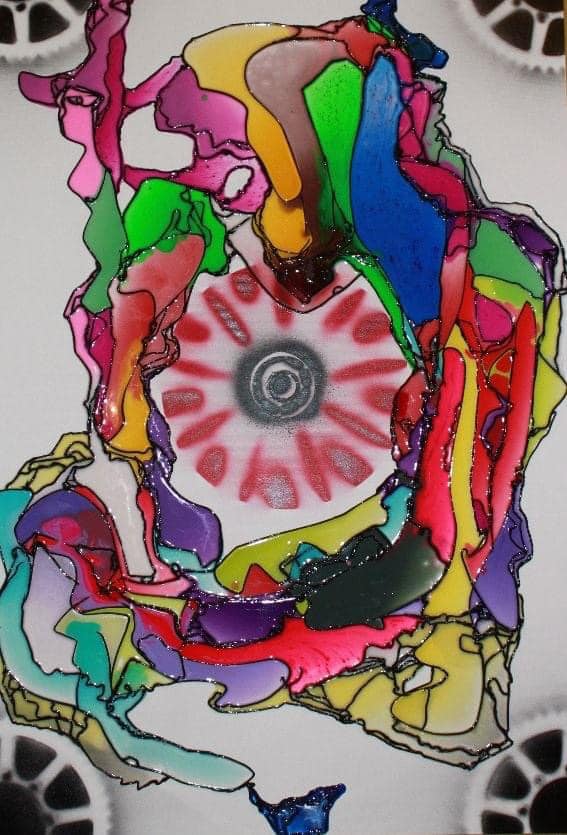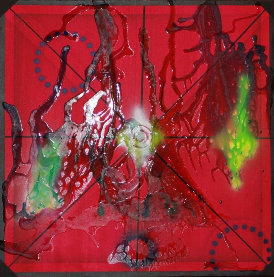 Pandolfo supera gli schemi anche nella tecnica usata, definita “polimaterica” per l’utilizzo di colori acrilici, resine epossidiche (materiali sintetici particolari), e silicone in diversi colori. Tutto su tela monocromatica, per un risultato dall’effetto psichedelico ad alto impatto visivo.