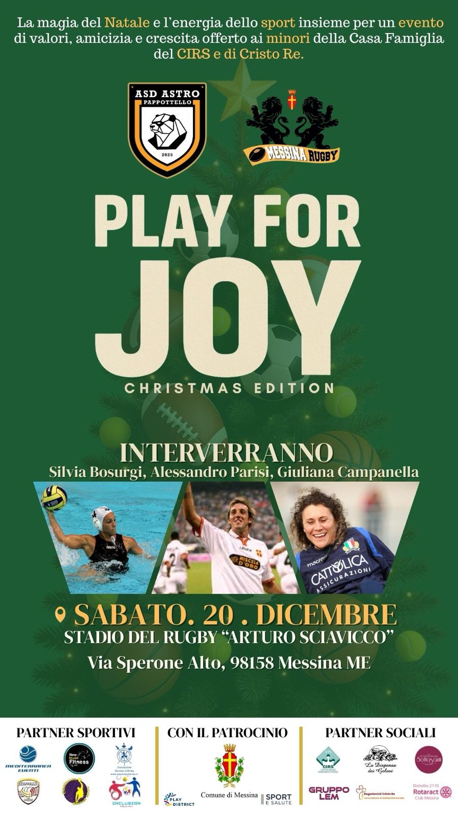 MESSINA Si terrà sabato 20 dicembre, presso lo Stadio del Rugby “Arturo Sciavicco” (a Sperone), l’evento “Play For Joy”, un’iniziativa promossa dall’ASD Astro Pappottello con l’idea di creare un momento di aggregazione e festa in cui sport, solidarietà e comunità si incontrano in un’unica grande esperienza condivisa. Un appuntamento che si inserisce nel contesto delle attività natalizie cittadine e si propone di offrire ai più piccoli, alle loro famiglie e a tutta la cittadinanza una giornata dedicata alla scoperta dello sport come veicolo di integrazione, inclusione e crescita personale. L’obiettivo principale, infatti, è quello di promuovere una cultura sportiva sana e aperta a tutti, in cui la competizione lascia spazio alla condivisione e al rispetto reciproco.