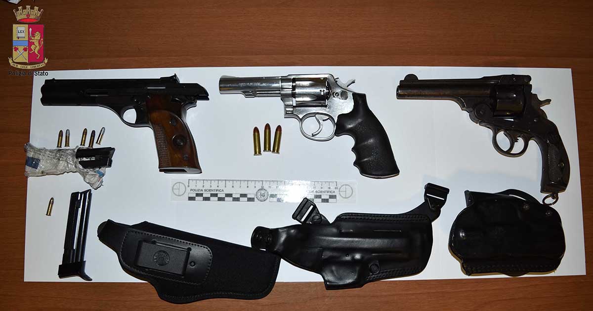 Giunti immediatamente sul posto gli agenti delle Volanti hanno identificato l’uomo che nel frattempo si era disarmato. Ma un accurato controllo tra le siepi adiacenti al luogo dove lo stesso è stato fermato ha permesso di rinvenire e sequestrare una pistola Beretta Calibro 22, ancora col cane armato ed un colpo in canna, che da un successivo controllo è risultata essere stata denunciata come oggetto di furto in data 15 maggio 2015. La consecutiva perquisizione effettuata presso l’abitazione ha permesso di ritrovare, nel garage occultate in un sacchetto per i rifiuti, altre due pistole revolver, una Smith & Wesson cal. 38 e un’antica F.Tettoni Brescia senza matricola.