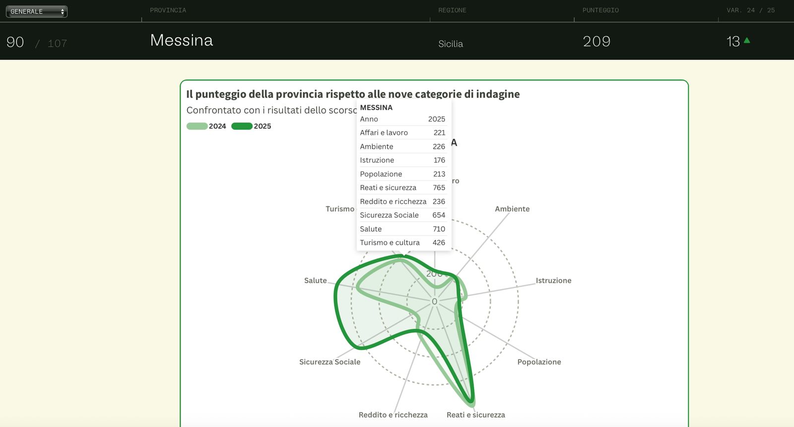 Lo studio si articola in nove dimensioni d’analisi: “affari e lavoro” (98esima), “ambiente” (101esima), “istruzione e formazione” (95esima), “popolazione” (92esima), “reati e sicurezza” (39esima), “reddito e ricchezza” (91esima), “sicurezza sociale” (654 punti, ma non si vede la posizione in classifica), “sistema salute” (23esima) e “turismo intrattenimento e cultura” (37esima), che hanno permesso di indagare in maniera approfondita i molteplici aspetti relativi alla qualità della vita a livello locale. Questa la condizione di Messina nel 2024: “Affari e lavoro” (105ma), “Ambiente” (102ma), “Istruzione” (95ma), “Popolazione” (95ma), “Reati e sicurezza”, (36ma) “Reddito e ricchezza” (89ma), “Salute” (22ma), “Sicurezza sociale” (36ma) e “Turismo e cultura” (41ma).