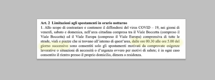 «Allo scopo di contrastare e contenere il diffondersi del virus COVID-19, nei giorni di venerdì, sabato e domenica, nell’area cittadina compresa tra il Viale Boccetta ed il Viale Europa (…), dalle ore 00:30 alle ore 5:00 del giorno successivo – si legge infatti all’articolo 2 dell’ordinanza sindacale – sono consentiti solo gli spostamenti motivati da comprovate esigenze (…)».