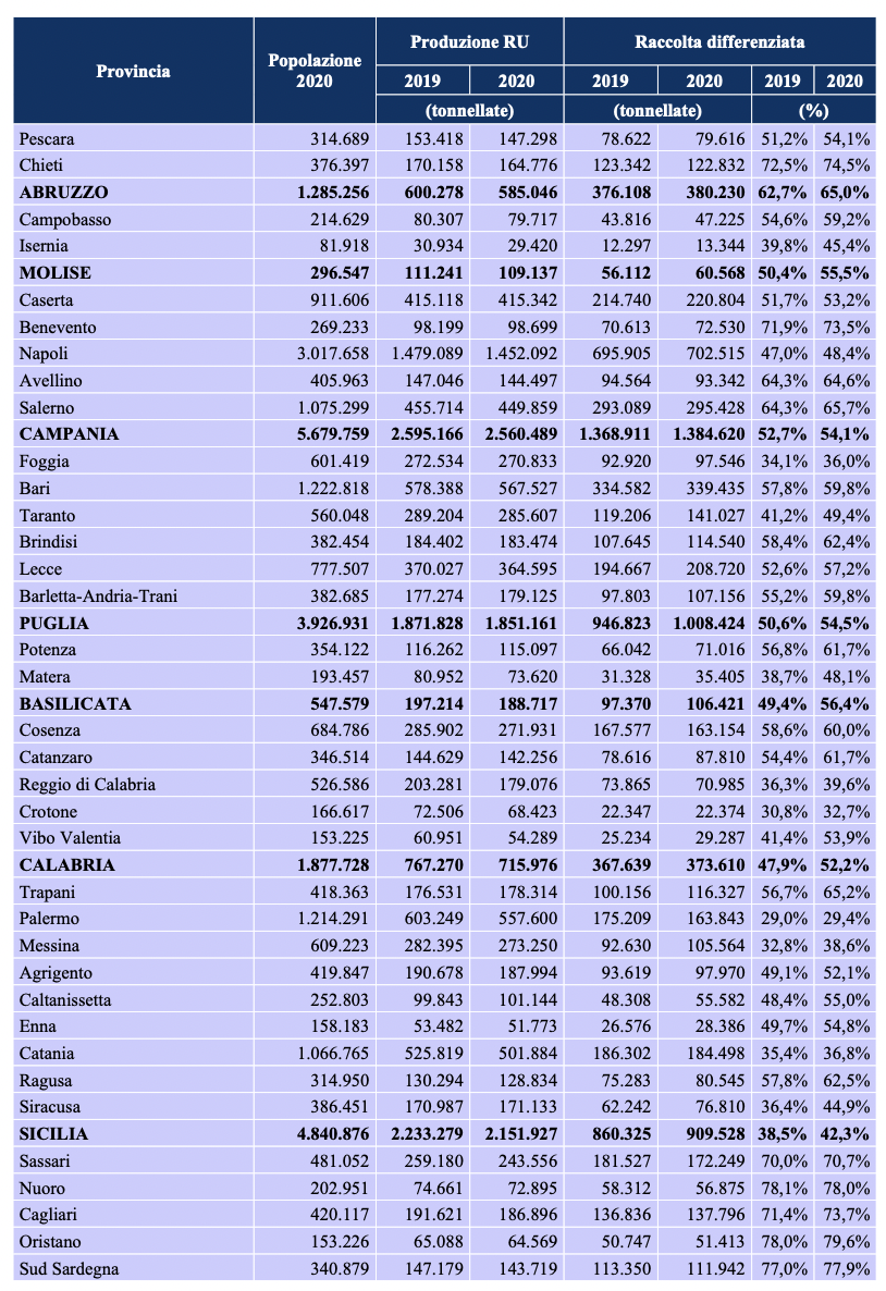 La Regione Siciliana, invece, conta a Messina e provincia il 35,8% di raccolta differenziata. Palermo e Catania variano rispetto ai dati Ispra di appena 0,1%, quindi per il dipartimento regionale la provincia messinese è penultima, avanti solo a Palermo. Neanche le altre province si discostano molto dai dati Ispra, Messina quindi è l’unica della Sicilia che conta incongruenze rilevanti fra i dati regionali e quelli nazionali.