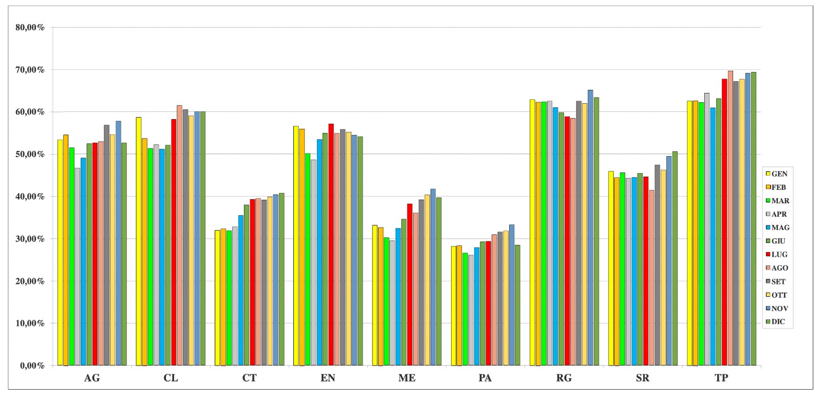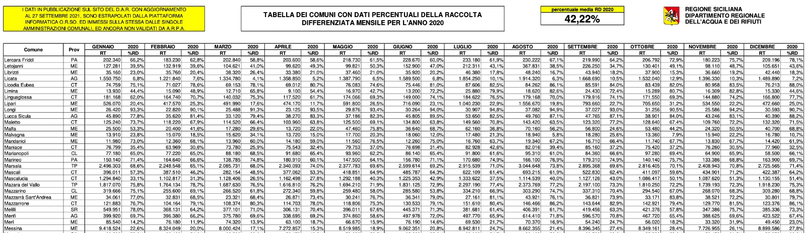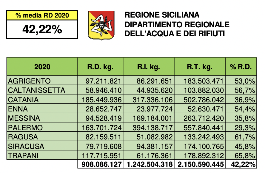 Di seguito il grafico con le nove province siciliane e l’andamento della raccolta differenziata nel 12 mesi del 2020 secondo la Regione Siciliana