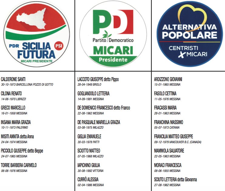 Gli aventi diritto di voto chiamati alle urne sono circa 4 milioni e 600mila. A Messina, le sezioni elettorali sono 254 e sono iscritti a votare 197 mila 470 elettori (93.421 uomini e 104.049 donne). Le liste ammesse sono undici: una ciascuna per Cancelleri, Fava e LaRosa, tre per Micari, cinque per Musumeci. Il dettaglio di tutti i candidati messinesi: