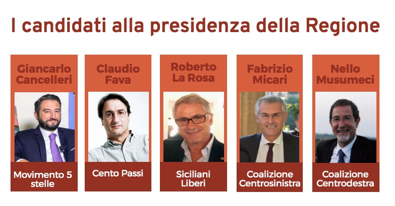 Oltre quattro milioni e mezzo di elettori siciliani sono chiamati al voto per eleggere il nuovo presidente della Regione e l’Assemblea regionale. Alla presidenza sono canditati in cinque: Giancarlo Cancelleri per il Movimento 5 Stelle, Claudio Fava per la lista Cento Passi, Roberto La Rosa per Siciliani Liberi, Fabrizio Micari per la coalizione di centrosinistra e Nello Musumeci per quella di centrodestra.