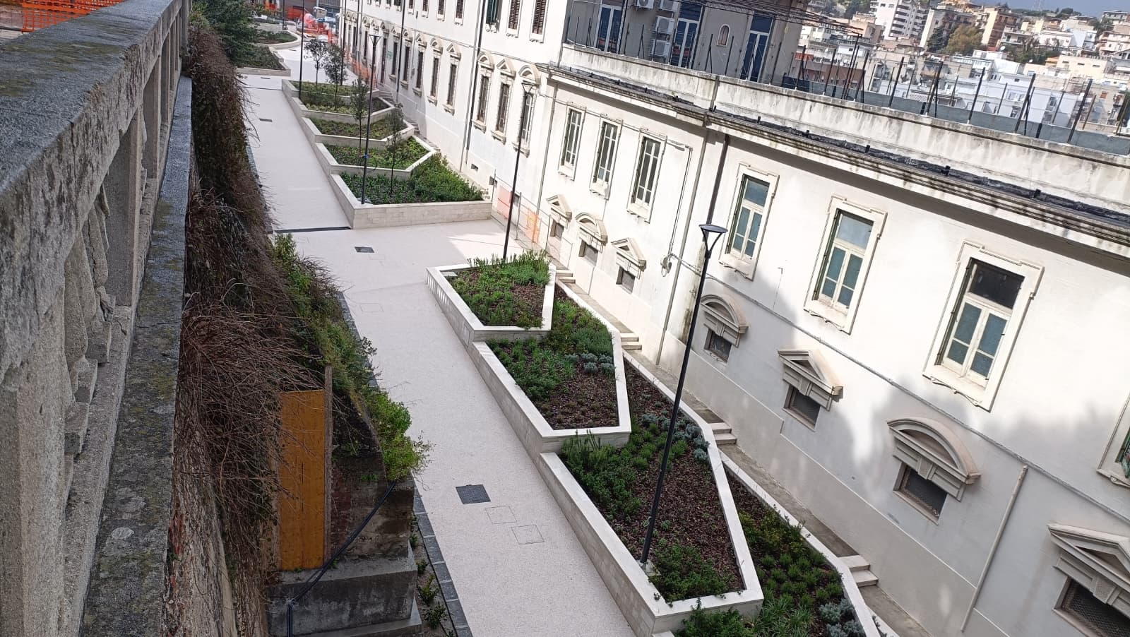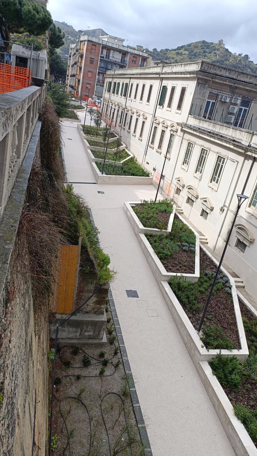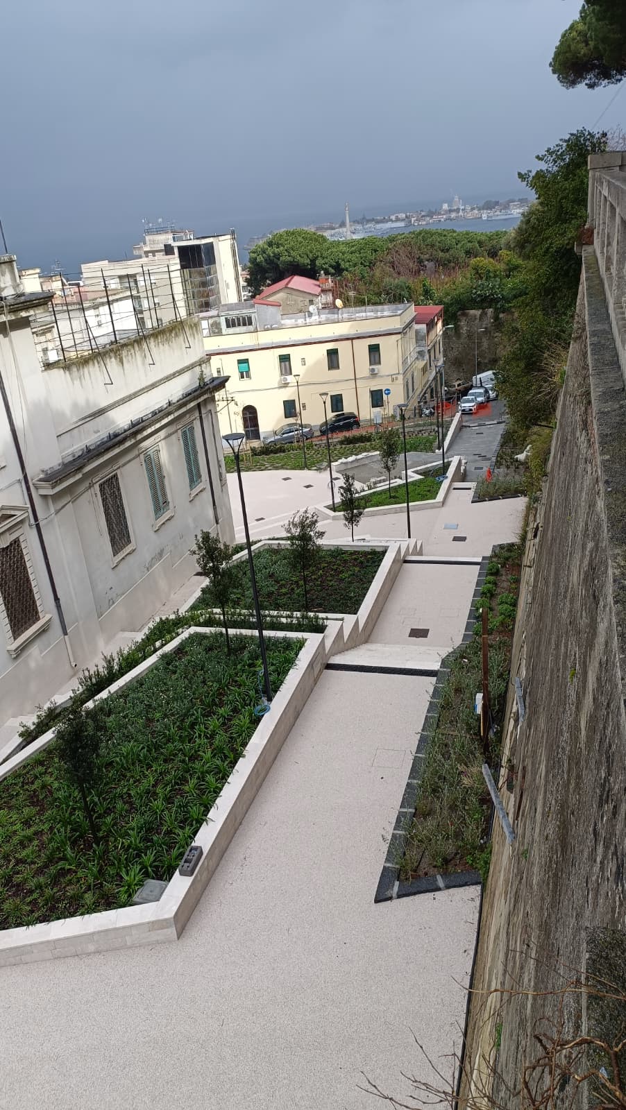 MESSINA. Prende ufficialmente forma il nuovo giardino realizzato in via Del Macello Vecchio, alle spalle dell’Istituto Buon Pastore (sede della Soprintendenza ai Beni Culturali di Messina): dove fino a ottobre del 2022 persistevano delle baracche addossate alle storiche mura di Carlo V, nell’ambito degli interventi di rigenerazione delle aree sgomberate, adesso fra il viale Principe Umberto e via Giacinto sorge una piazzetta che culmina all’entrata della chiesa del Buon Pastore. Un belvedere da 1,2 milioni di euro, con tanto di anfiteatro, intitolato a Caravaggio (e nella quale si vuole collocare anche una statua di Michelangelo Merisi).