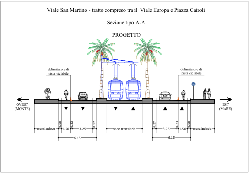 Diversa la conformazione dal viale Europa, dovuta anche alla disposizione differente dei binari. In questo caso la pista ciclabile sarà posizionata al due lati della grossa corsia centrale, mentre il tram transiterà regolarmente sulle corsie esterne, misurerà sempre un metro e mezzo di larghezza, e sarà anche qui delimitata da cordoli (foto sotto).
