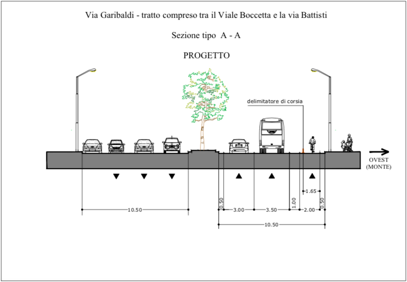 Anche nell’attuale pista ciclabile (quella del quadrilatero corso Cavour – viale Boccetta – via Garibaldi – via Cesare Battisti – via Tommaso Cannizzaro) ci saranno profonde modifiche: torneranno i cordoli in corso Cavour, che delimiteranno sia la corsia ciclabile (che rimarrà dell’attuale larghezza, 1,5 metri) che la corsia preferenziale per bus, pullman e auto di servizio, separandole fisicamente sia tra loro che dal traffico veicolare. In via Garibaldi il cambiamento sarà ancora più radicale: nella corsia che oggi ospita la pista ciclabile, cioè quella in direttrice nord-sud, direzione piazza Cairoli, le corsie per le auto si ridurranno a una, e la pista ciclabile sarà allargata dai 90 cm attuali a un metro e mezzo, delimitata dalla corsia per i bus da una cordolatura. In corrispondenza delle fermate del bus, inoltre, verrà realizzata un’isola “salvagente” tra il bus e la pista ciclabile da un metro e mezzo, in corrispondenza della quale la corsia ciclabile si restringerà a un metro e venti (foto sotto).